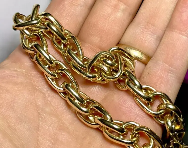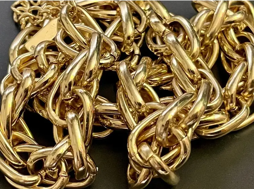 The necklace is 21" long, including the clasp and 10cm. wide. A very high, clean polish. Double link chain. A very solid weight of 106 grams.