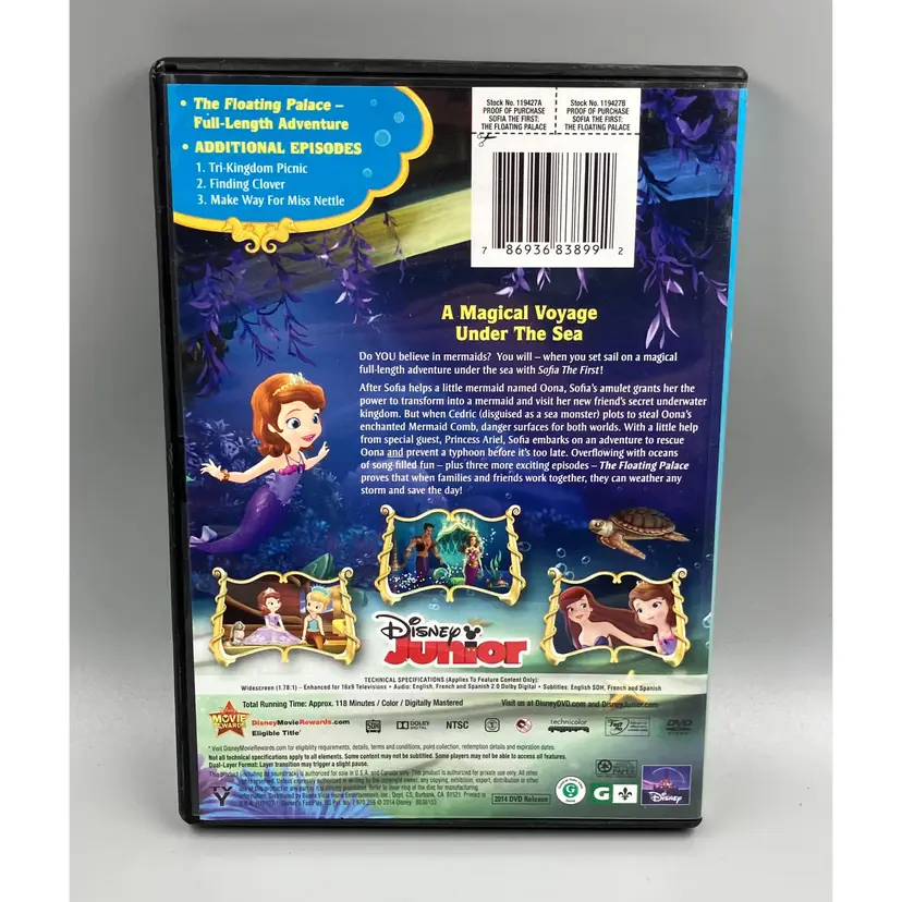Sofia the First: The Floating Palace DVD featuring a special appearance by Ariel. In very good used condition. In stock and ready to be shipped.