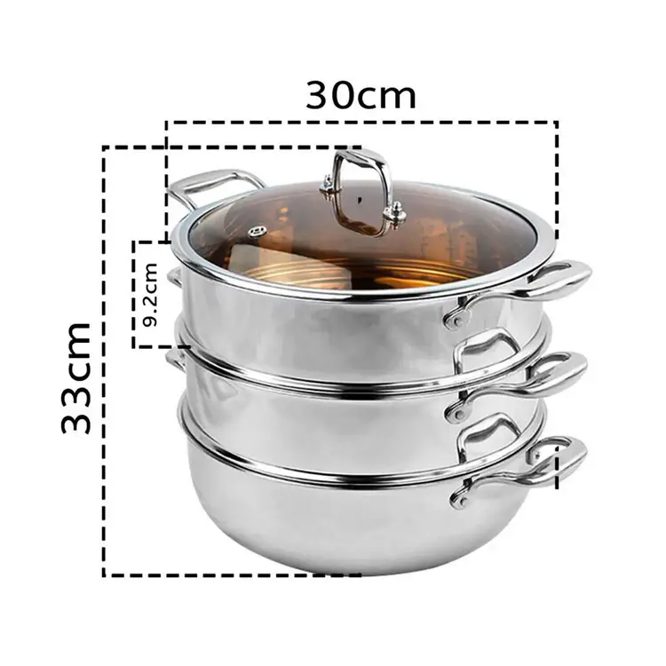 ✔ Material: 18/10 stainless steel ✔ Size: 30cm ✔ Height: 33cm ✔ Single Layer Height: 9.2cm ✔ Weight: 6kg ✔ Carton Size: 38 x 27 x 36cm
