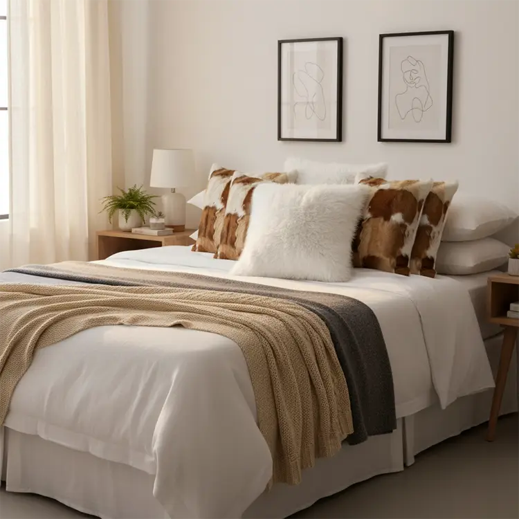 Elegant Textured Covers: Pure white textured pillow covers provide a clean, sophisticated contrast for layered styling.