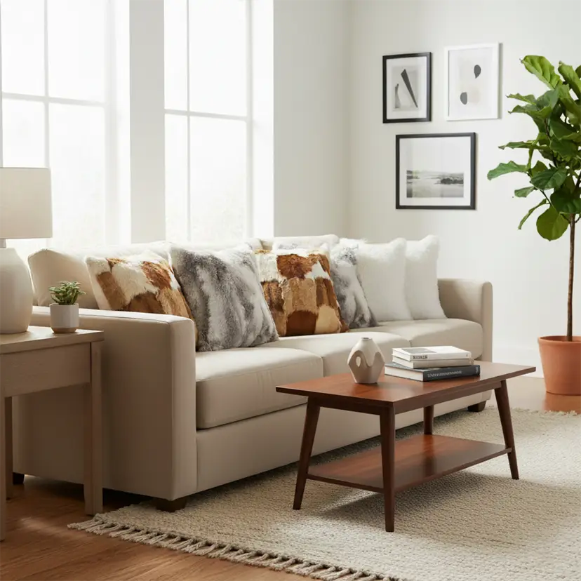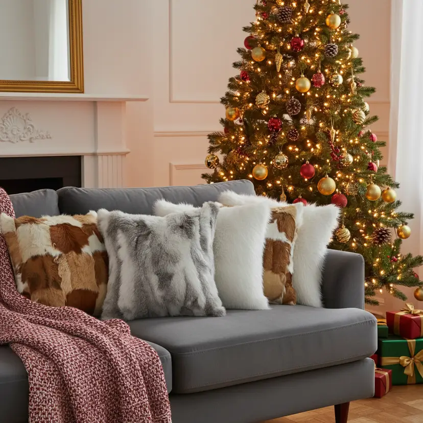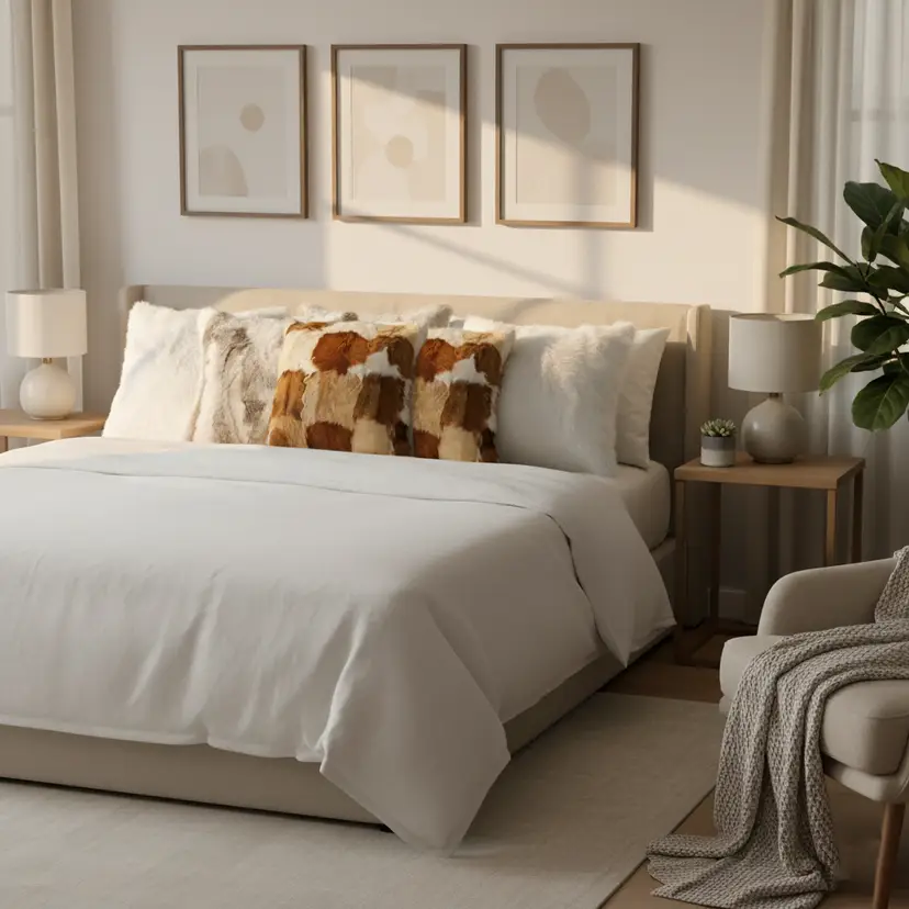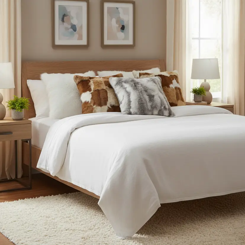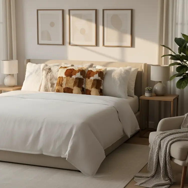 Textured & Layered Design: Cowhide patchwork, pure white textures, and faux fur details create depth, warmth, and a stylish, modern look.