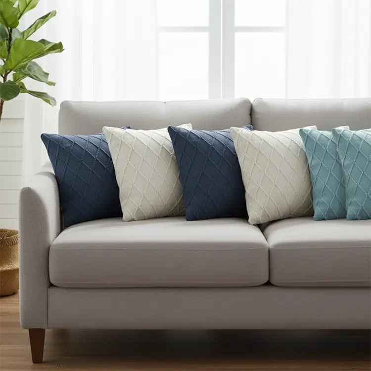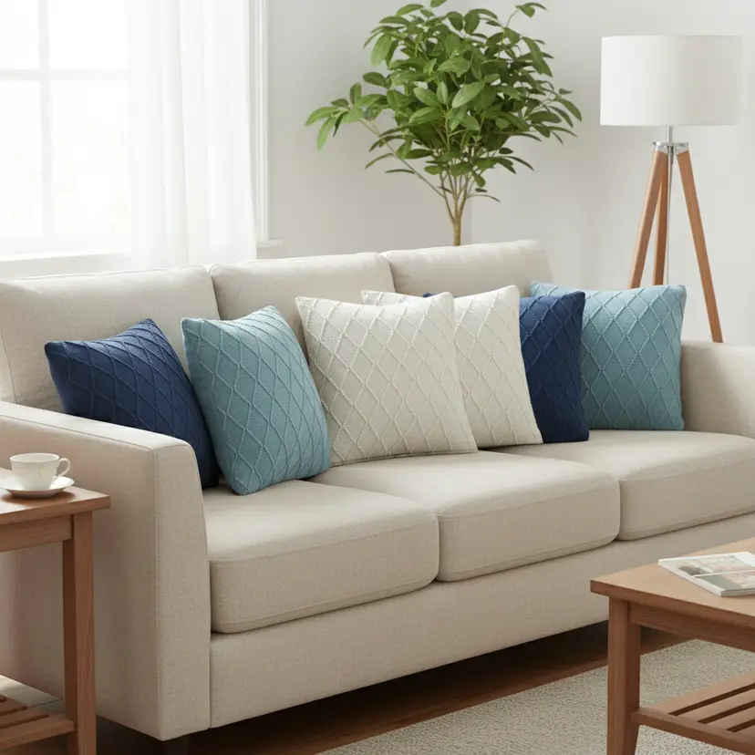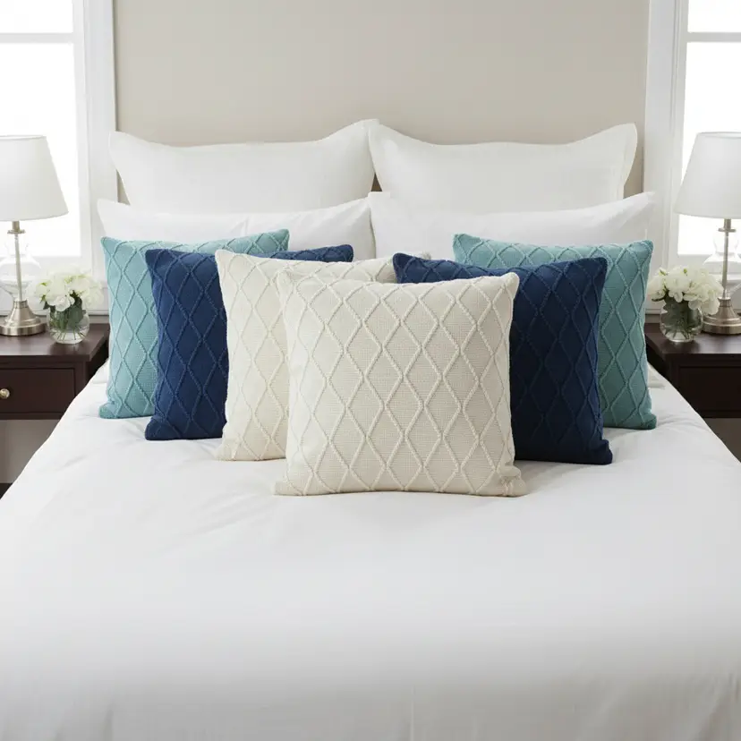 Coordinated & Stylish Design: A harmonious mix of cream cable knit diamond covers with navy blue and sky blue diamond knit patterns for a layered, elegant look.