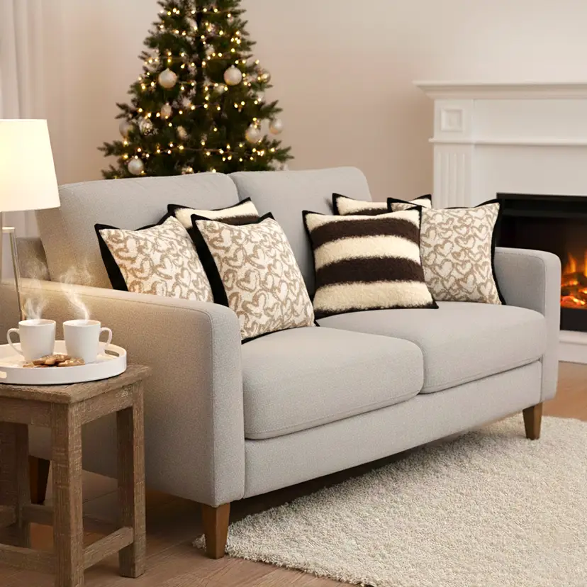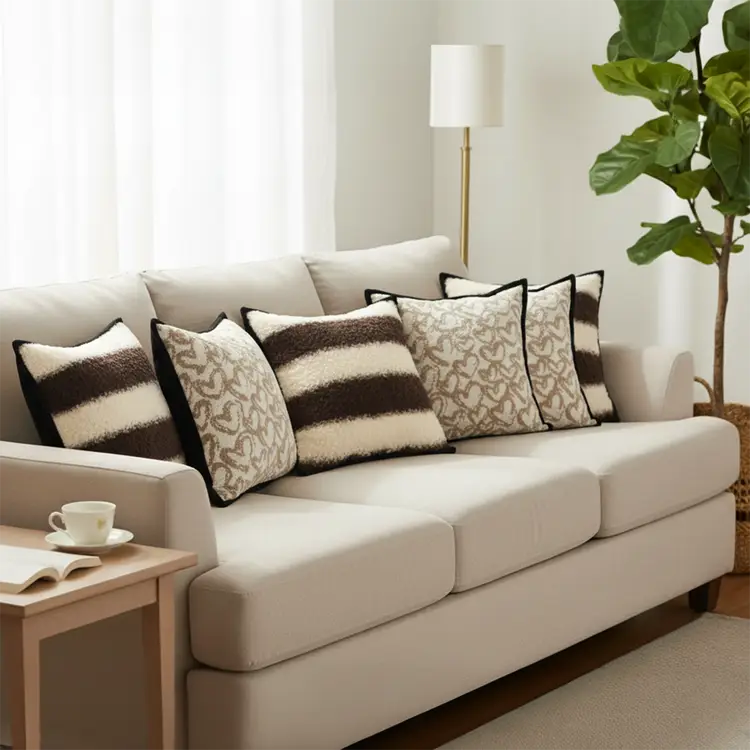 Unique & Eye-Catching Design: Features heart pattern covers with contrasting black trim paired with brown and cream striped bouclé styles for a layered, decorative look.