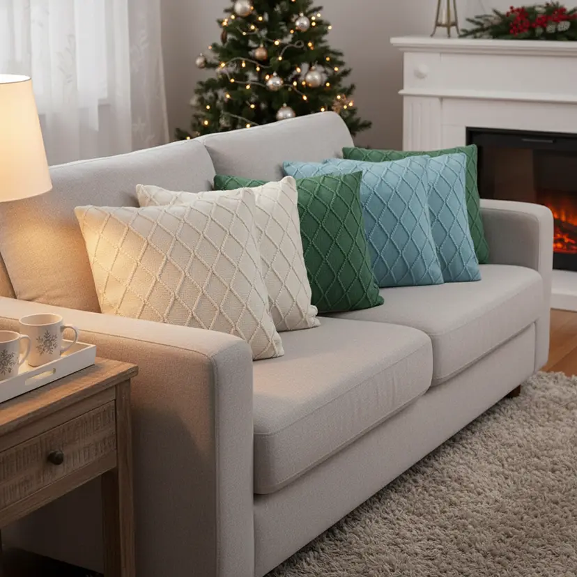 Elegant & Coordinated Design: Cream cable knit covers paired with navy and sky blue diamond knit patterns for a layered, sophisticated look.