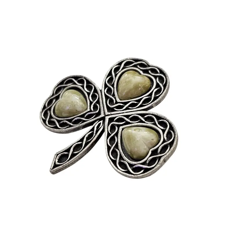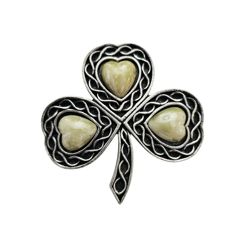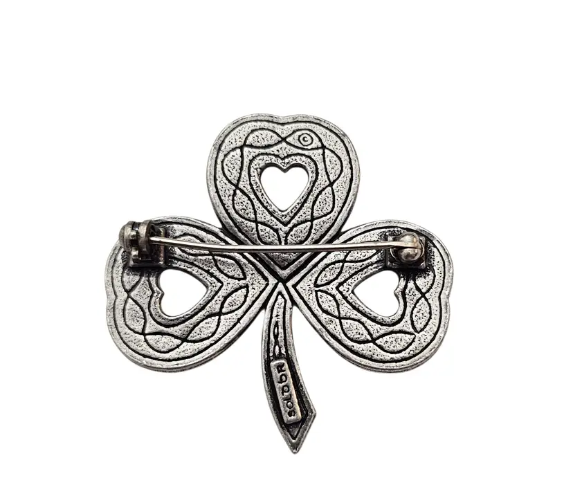 • Sol D'Or Silver Tone Shamrock Clover Leaf Brooch • Vintage 1970s costume jewelry • Irish shamrock-inspired piece • Traditional Celtic style • Silver tone base metal • Heart-shaped stones • Placed at the center of each leaf • The stones have a marble-effect surface • Measures approximately 1.6 inches in width and length • Hallmarked SOLDOR on a rectangular cartouche on the reverse • It has a straight pin and a locking clasp, ensuring it stays firmly attached to your clothing or accessory throughout the day • Good condition • C80