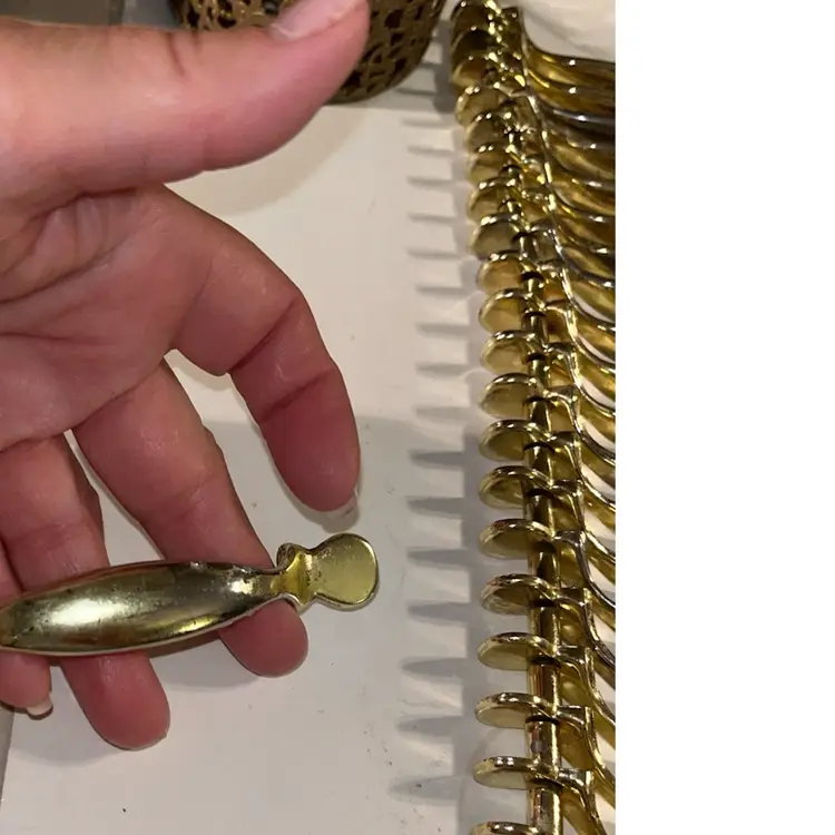 23 drawer pulls. Showing wear and marks. Perfect for the DIY lover!!! Marked Taiwan 991030 C. Comes with screws. Unsure if all are there. Drawer pulls are 3”