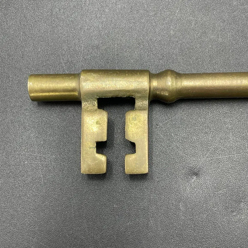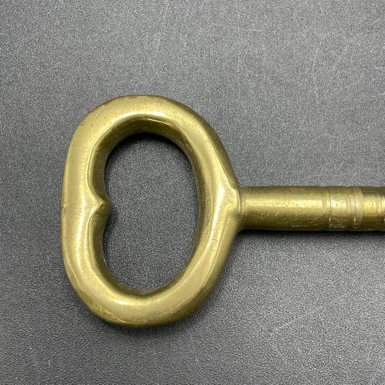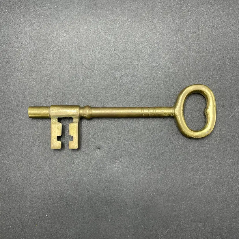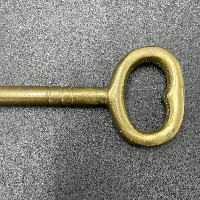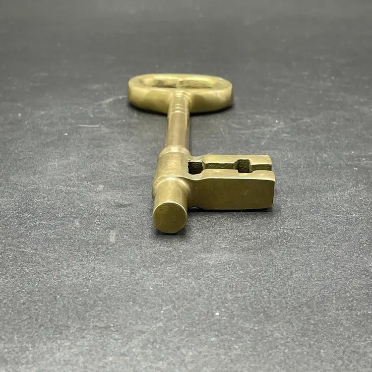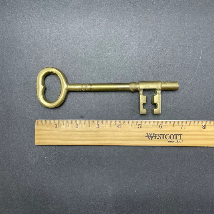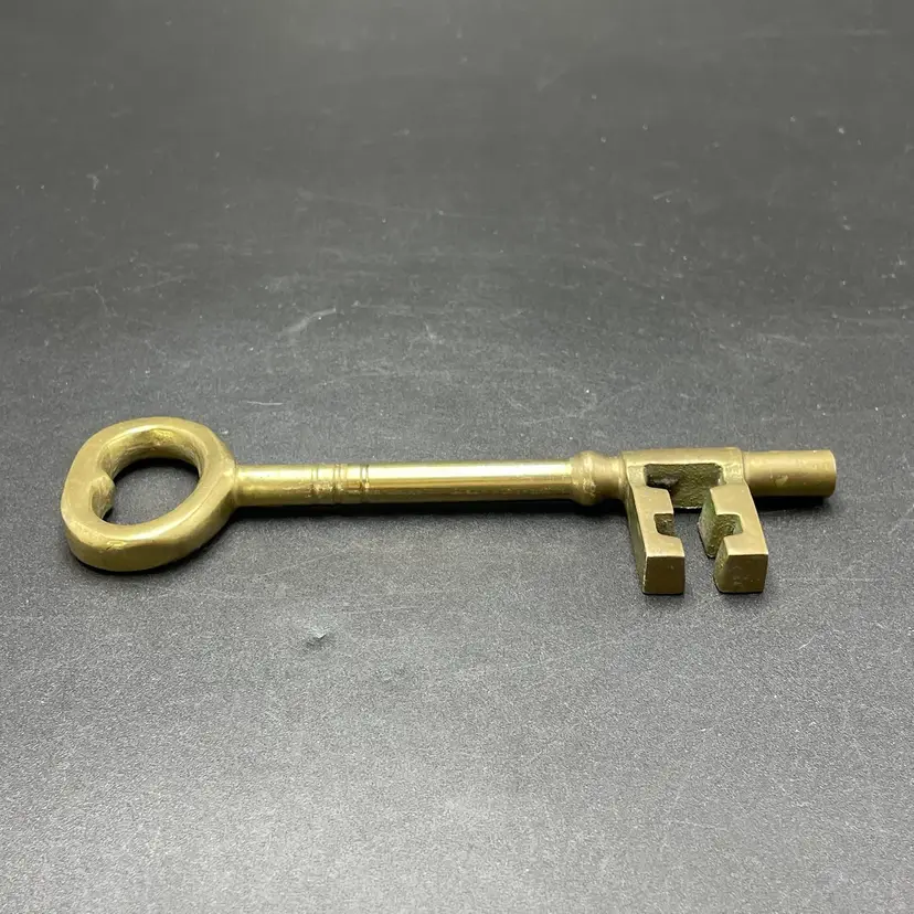 This is a large vintage solid brass skeleton key. Measures approximately 7" long. No major flaws.