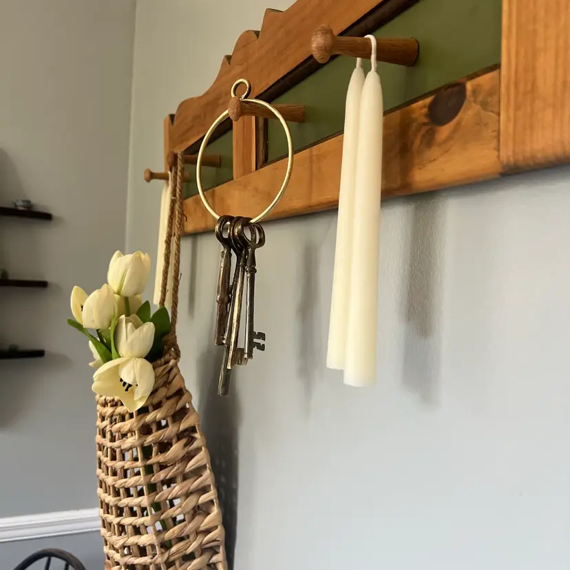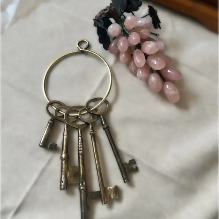 Solid brass ring with 5 varying sizes of skeleton keys. About 12 inches from top of loop to bottom of the longest key. About 6inches across.
