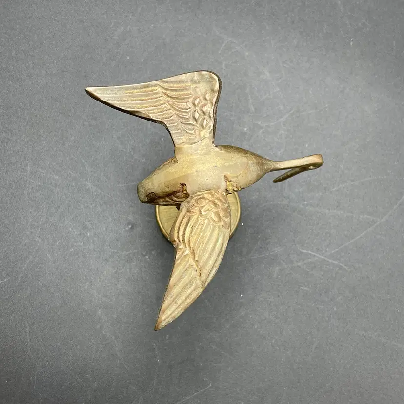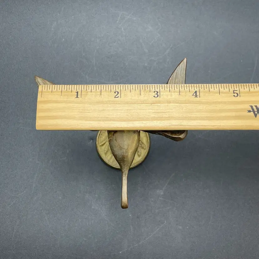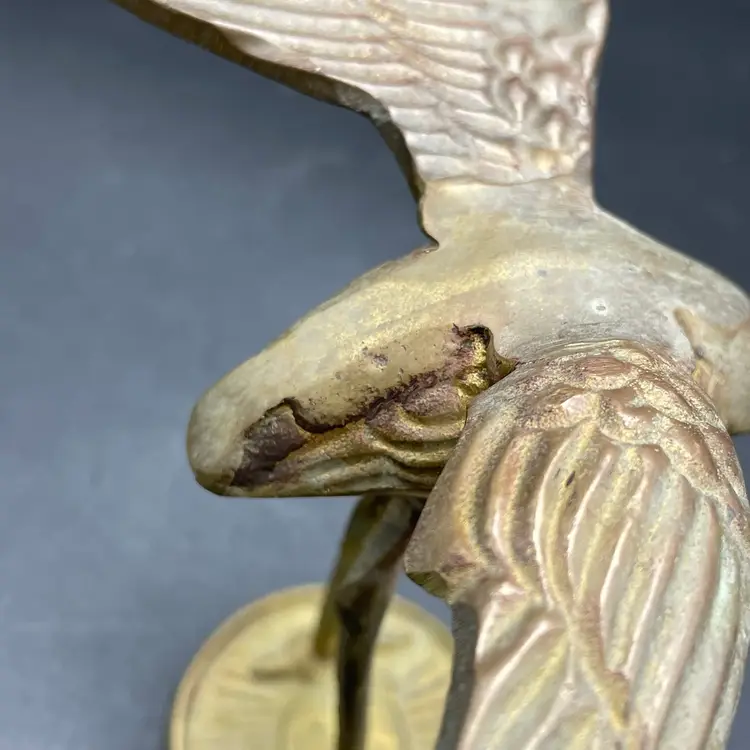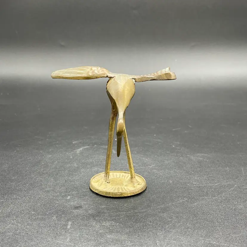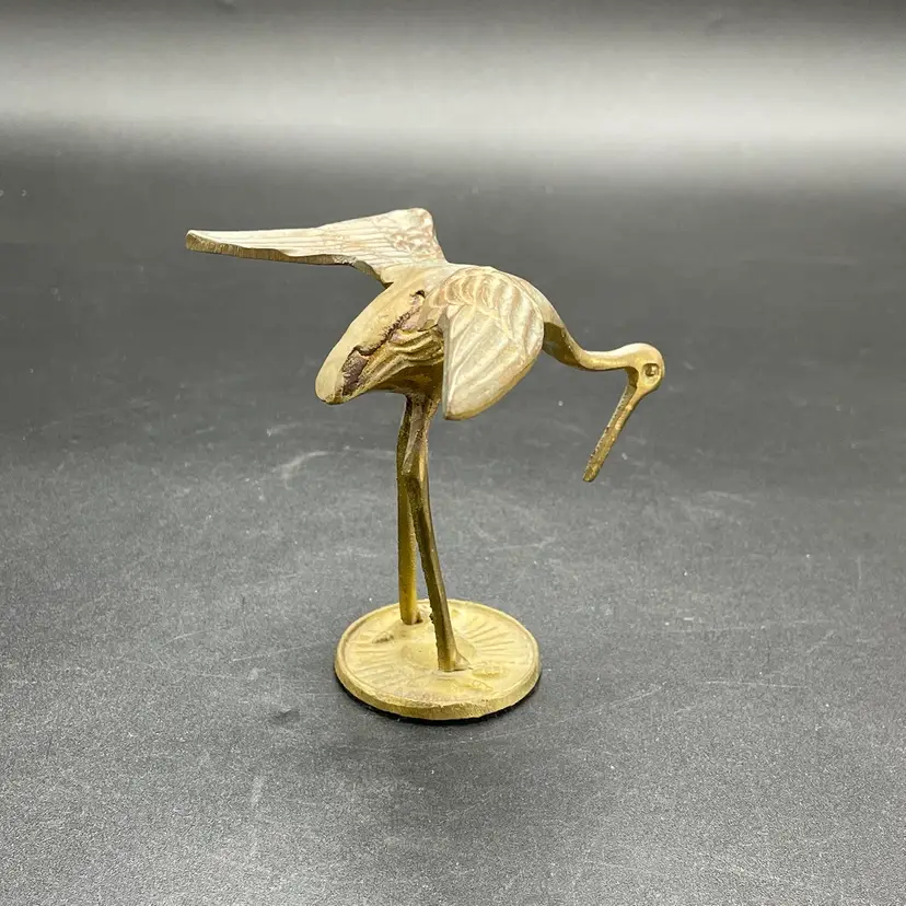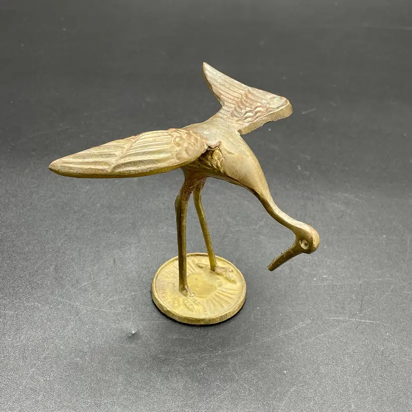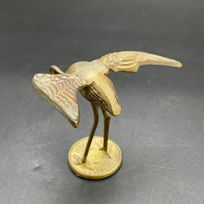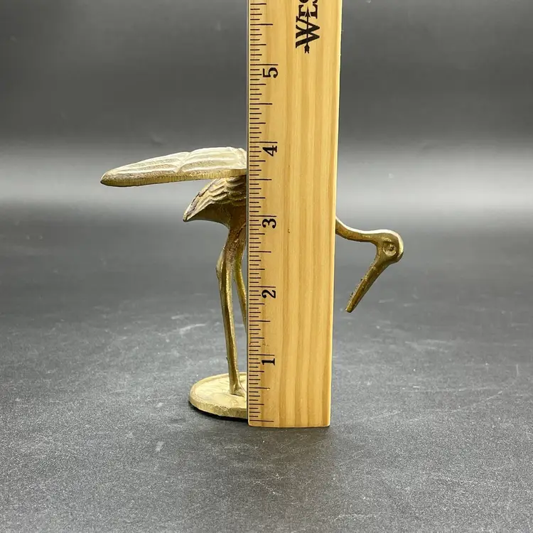 This is a vintage solid brass standing crane figurine. Measures approximately 4" tall x 3.75" across. There is some wear due to age and use such as tarnishing. No major flaws.