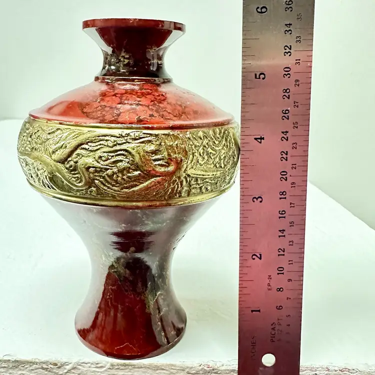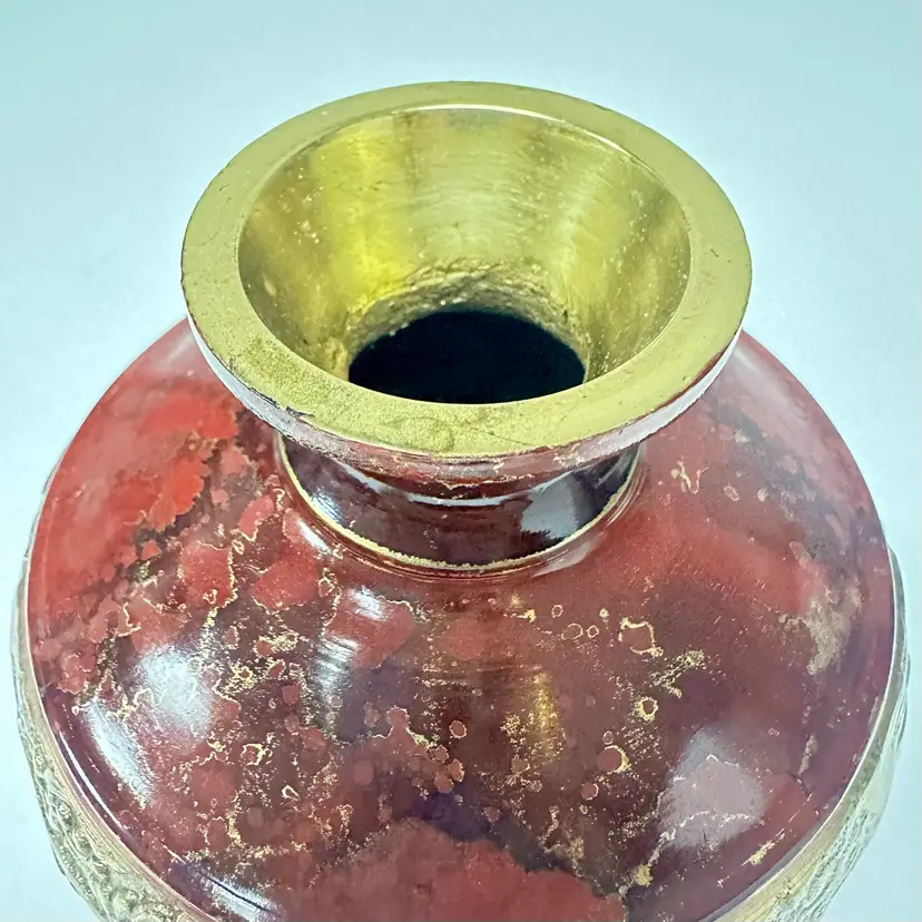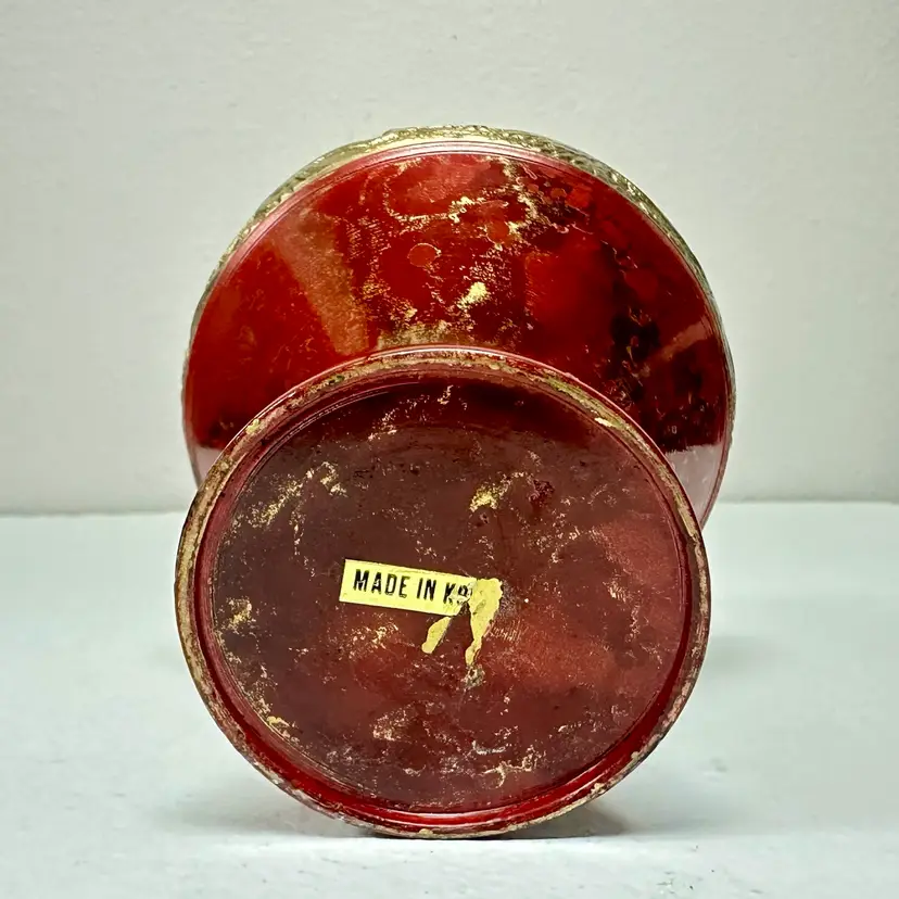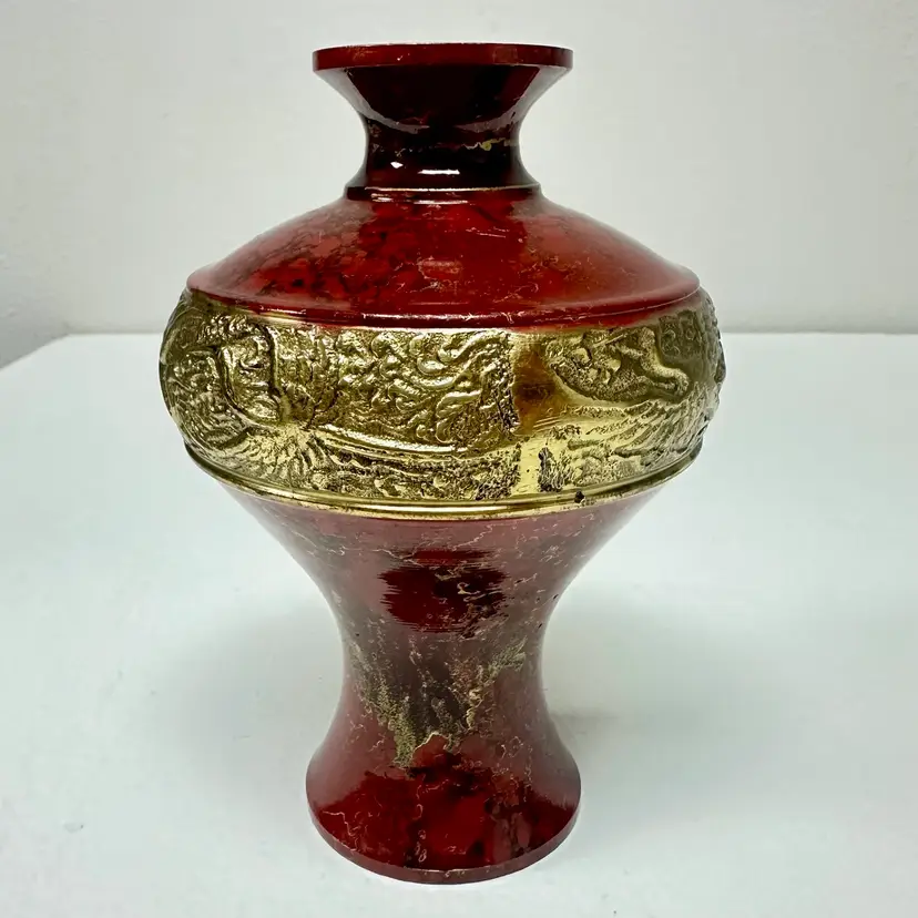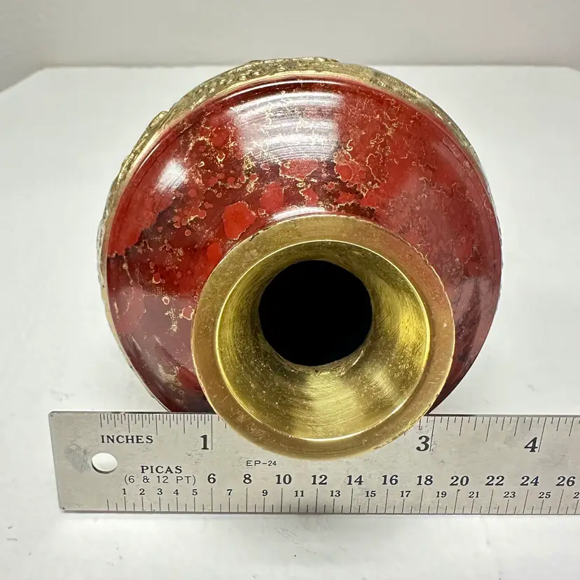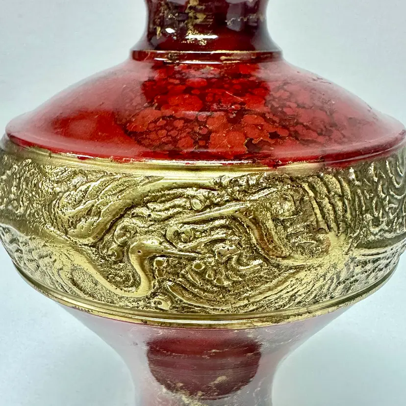 This listing is for a solid brass base featuring a unique red marbled enamel design on some of the surface, adding a touch of vintage charm to any space. It has a brass band in the middle depicting two cranes in flight. There is part of a sticker on the bottom that might read “Made in Korea”. The combination of brass and enamel creates a distinctive and eye-catching piece that can elevate any collection of antique or vintage items.