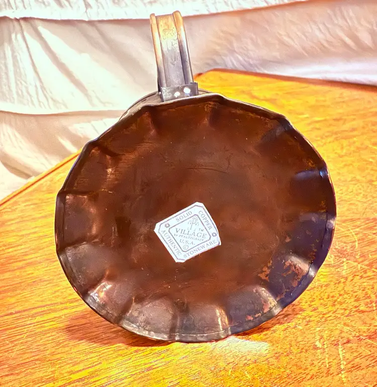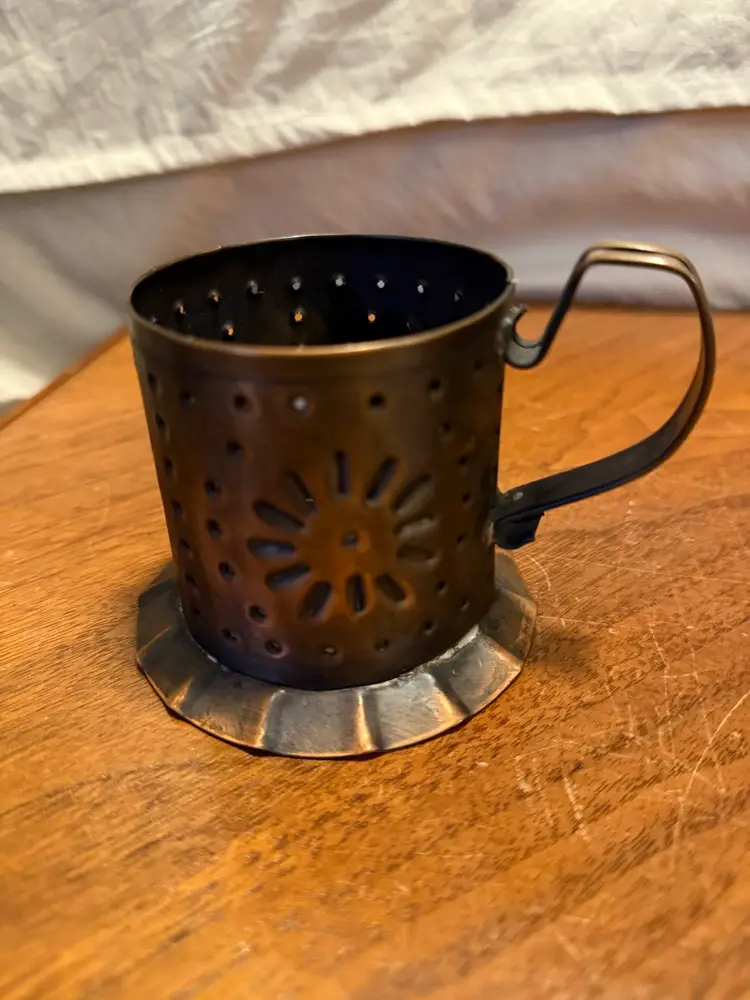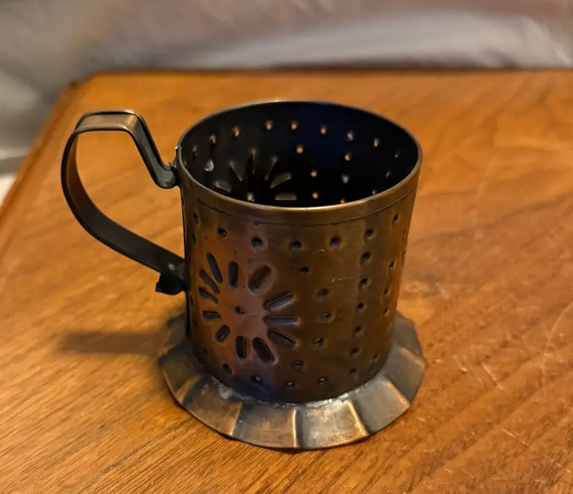 Vintage Solid Copper Mug Candle Cup by Village by Realities. This piece features a beautiful punched design, ideal for casting unique light patterns when used with a candle. The base is marked "Authentic Stoneware Made in USA." This item is in excellent pre-owned condition with natural patina consistent with age.