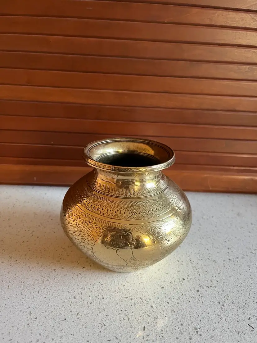 Beautiful etchings on this solid heavy brass vase/ kalash traditional item from India