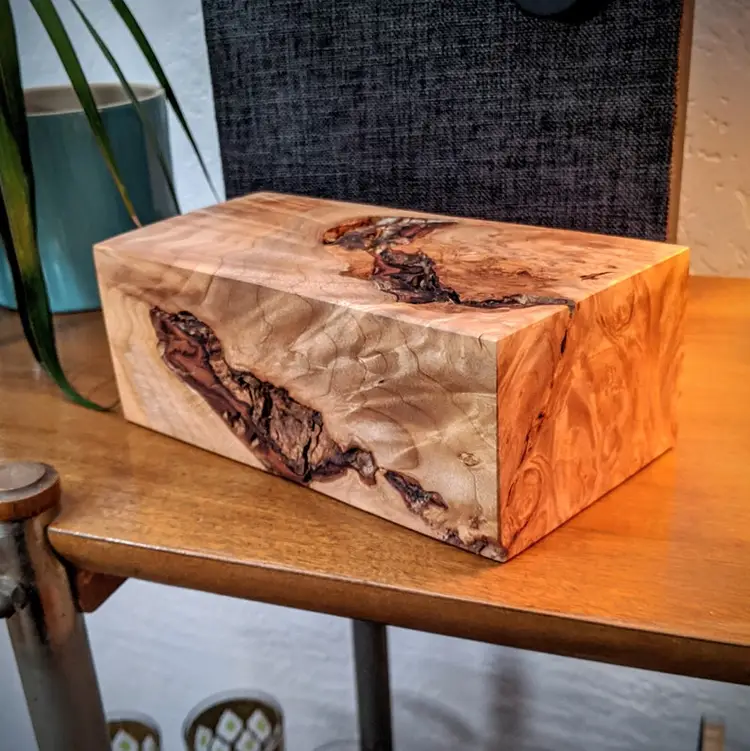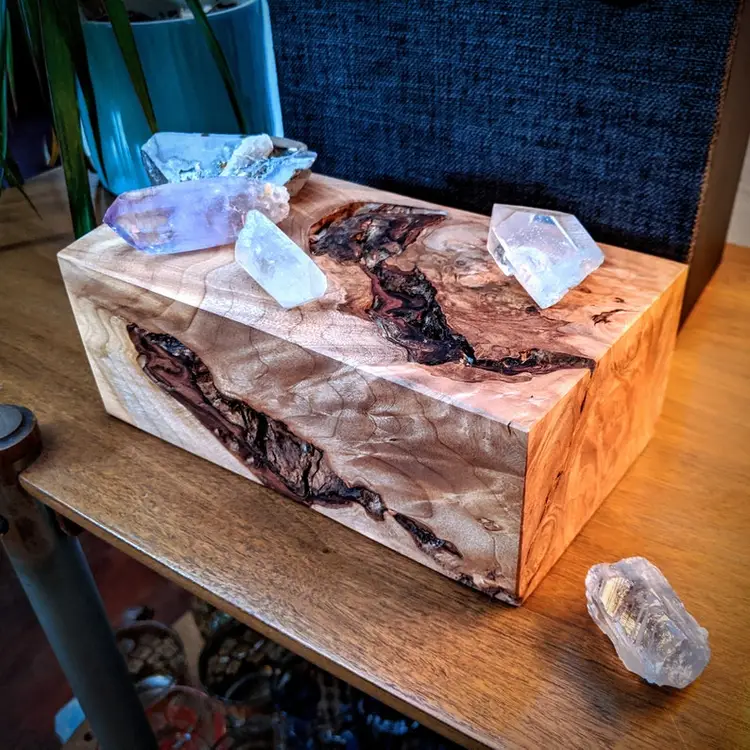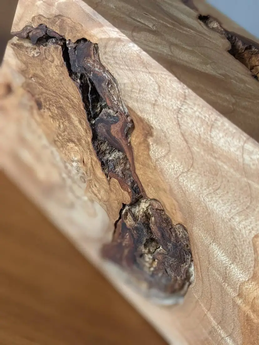 This is a solid, quilted Maple burl display pedestal that's sanded and surfaced with a food grade oil+wax finish, and detailed with lightly beveled edges. This pedestal is beautiful from all angles! ๐