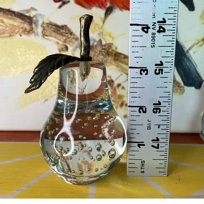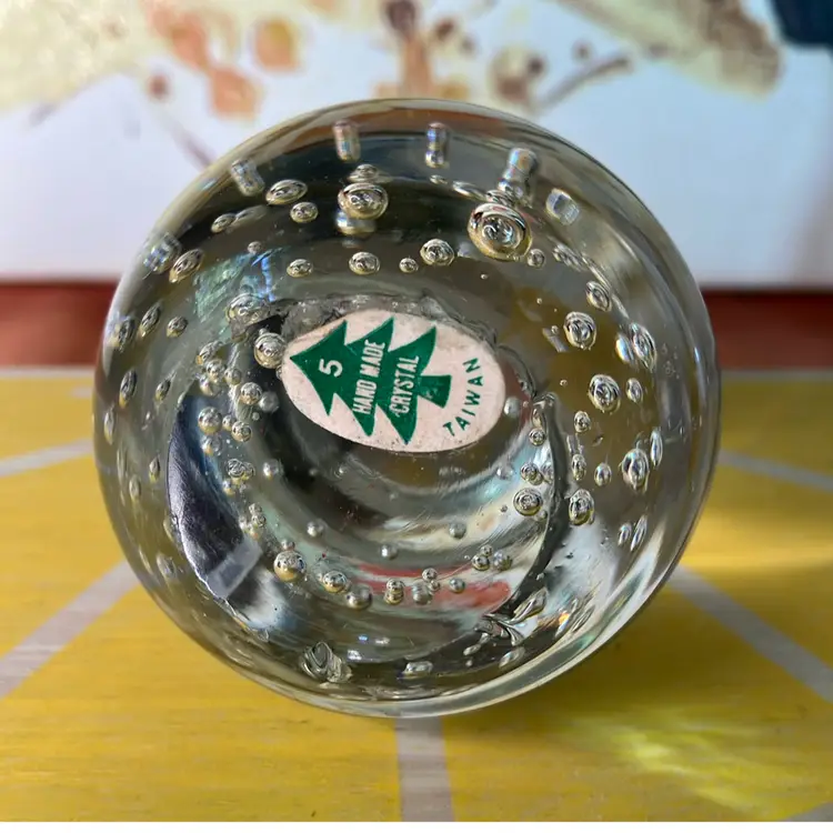 Sticker says Handmade crystal Taiwan. Metal stem and leaf. Good condition with minor wear.