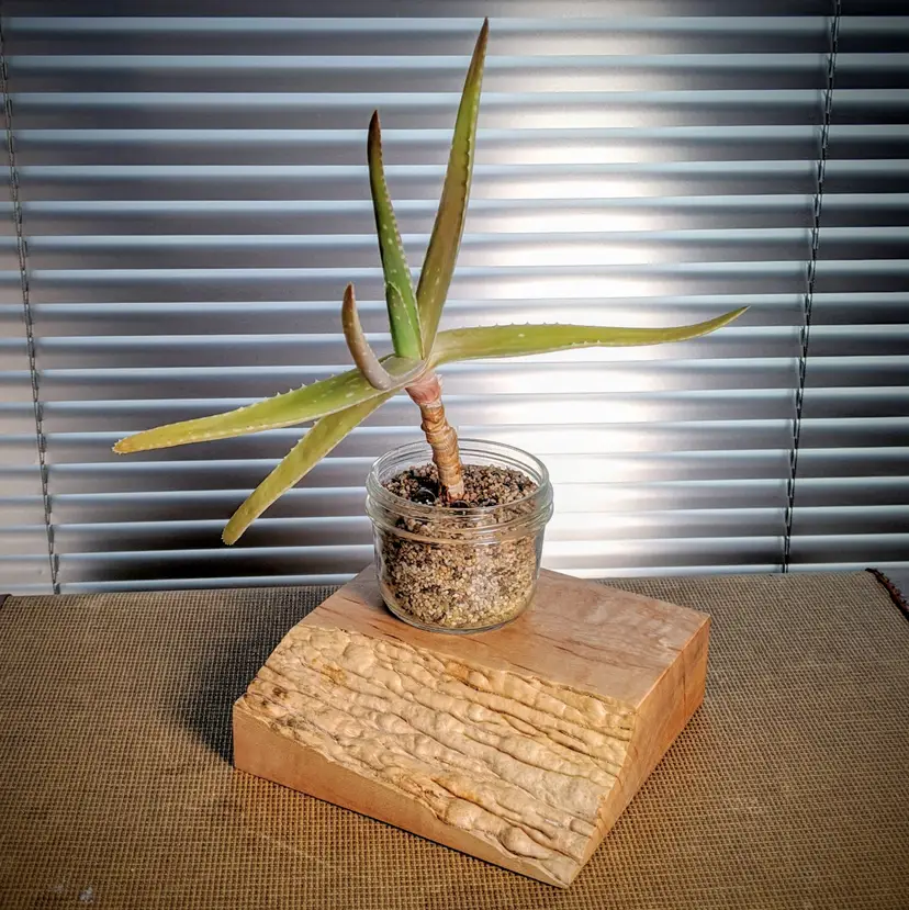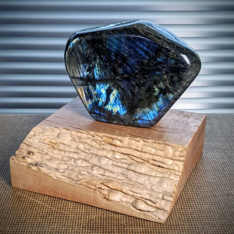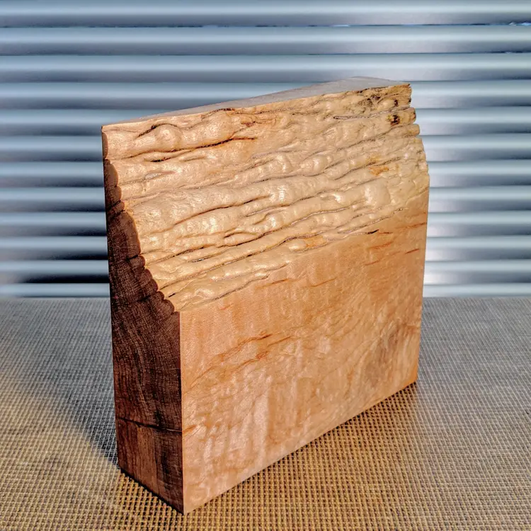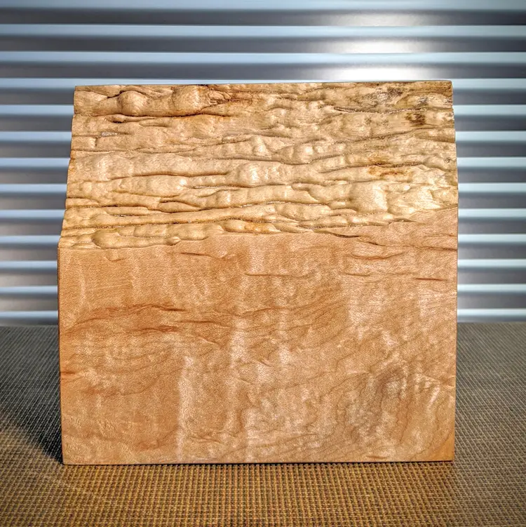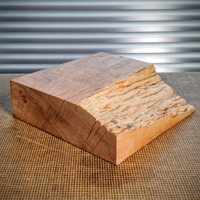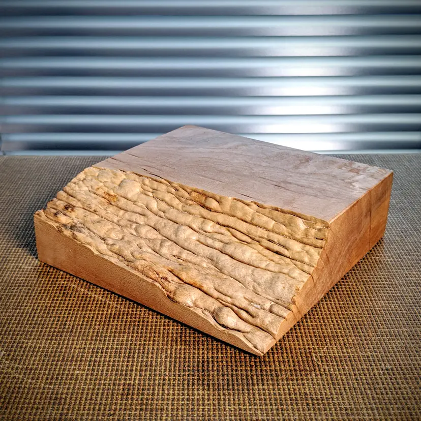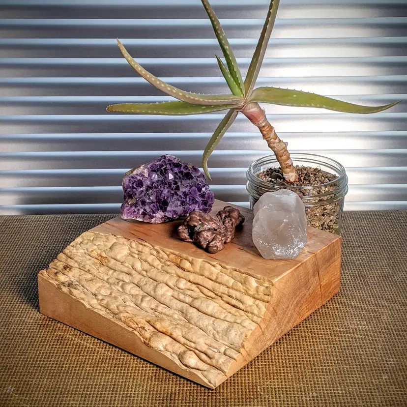 This is a solid, quilted Maple burl display pedestal that's sanded and surfaced with a food grade oil+wax finish, and detailed with lightly beveled edges. This pedestal is beautiful from all angles! ๐