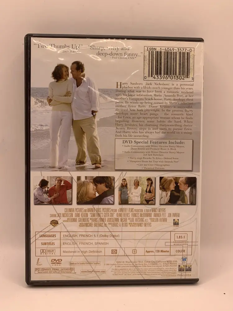 A sophisticated romantic comedy which proves that in matters of the heart you can expect the unexpected. Direction: Nancy Meyers Diane Keaton Jack Nicholson Keanu Reeves. Special Features: Full frame format. Language: English Year: 2003 Runtime: 128 minutes.Size: Unisex OS