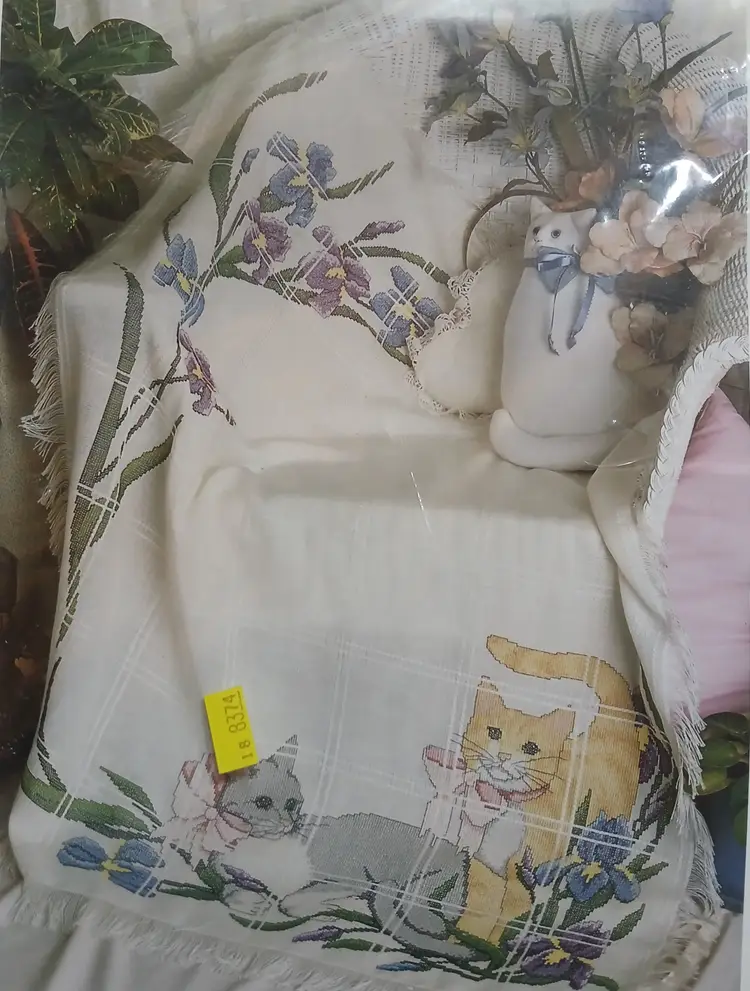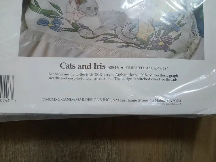 Vintage Cat and Iris 50546 counted cross stitch afghan kit by Something Special. 18 count cross stitch, finished size 45" x 58". New in sealed package.