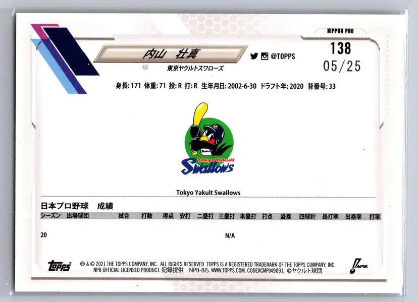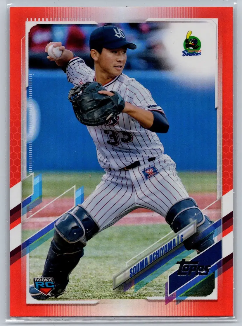 Souma Uchiyama rookie card from 2021 Topps Chrome NPB, featuring the Orange parallel limited to just 25 copies. A sharp, low-numbered Chrome rookie from the Tokyo Yakult Swallows, offering strong visual appeal and scarcity. A solid pickup for NPB collectors and those building premium Japanese baseball rookie collections.