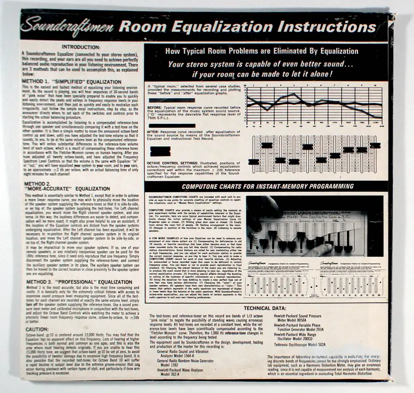 Instructional Test Record, by Soundcraftsmen, is a specialized vinyl LP designed to calibrate and optimize audio frequency equalizers for high-fidelity sound systems. Produced in Santa Ana, California, the album features test tones and frequency ranges to assist users in fine-tuning their audio equipment, particularly Soundcraftsmen’s graphic equalizers. It includes instructional materials like equalizer charts to guide the calibration process.