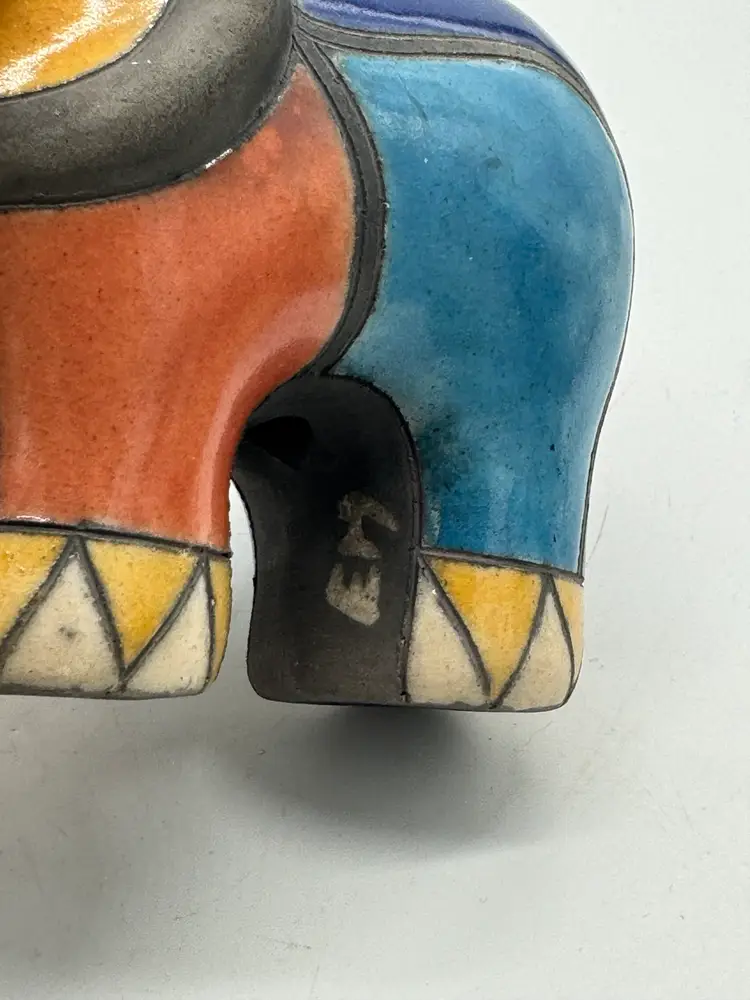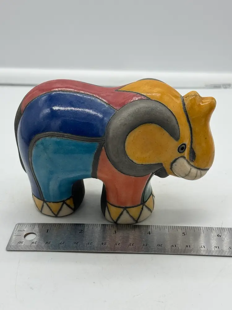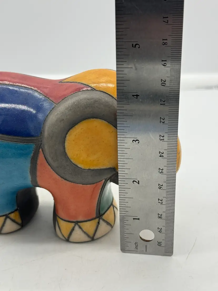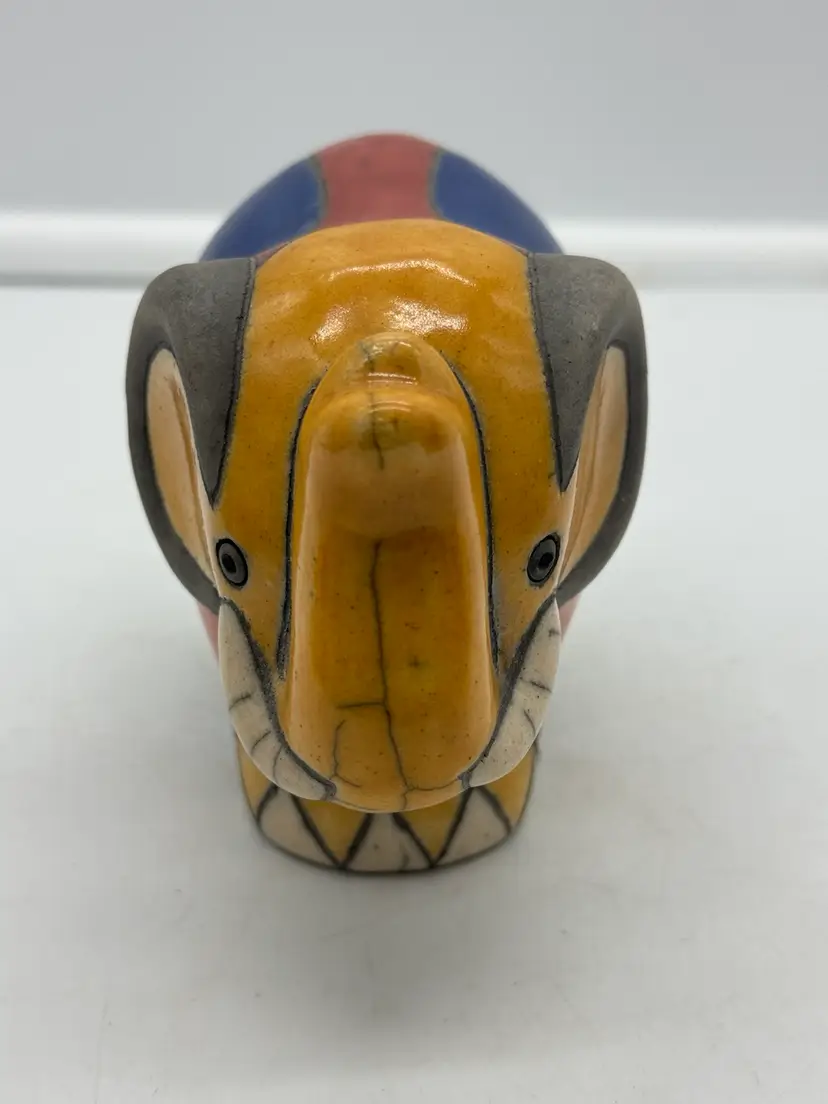 Colorful Raku pottery elephant, trunk up for good luck. Measures 4 inches tall & 5 1/2 inches long. Signed on the bottom. No chips.