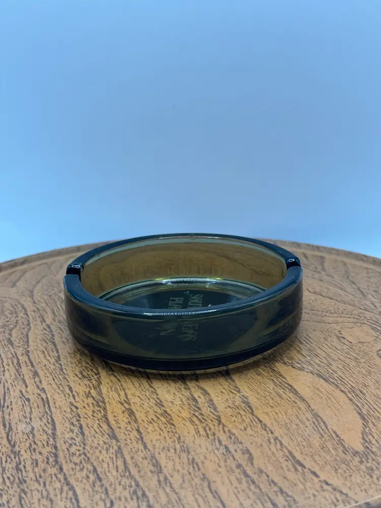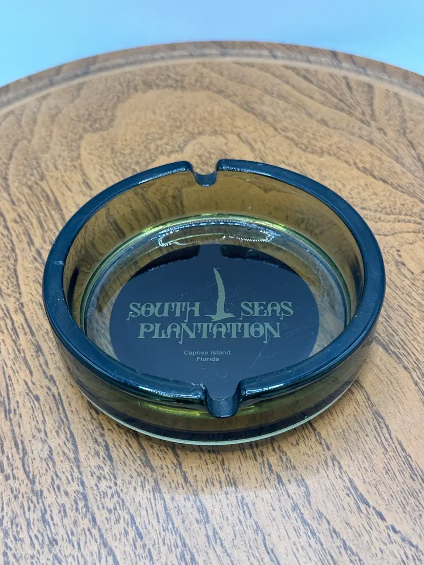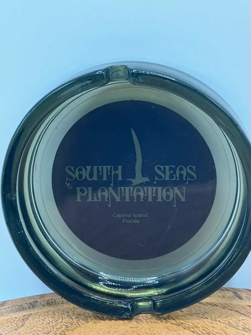This vintage glass ashtray is a unique addition to any collection. With a stunning design inspired by the South Seas Plantation on Captiva Island, Florida, this piece is a must-have for anyone who loves Americana and tobacciana. Measuring 4 inches in diameter, it is the perfect size for display or use.