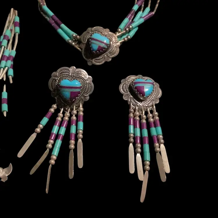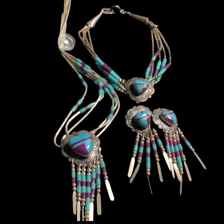 Necklace,earrings and bracelet are Sterling Silver tested Turquoise and sugilite Mid 20 century Very beautiful set