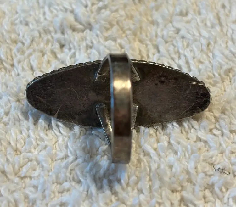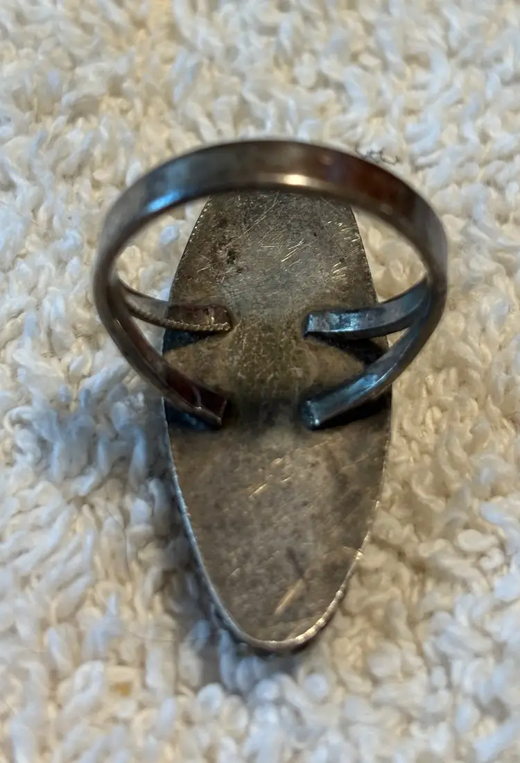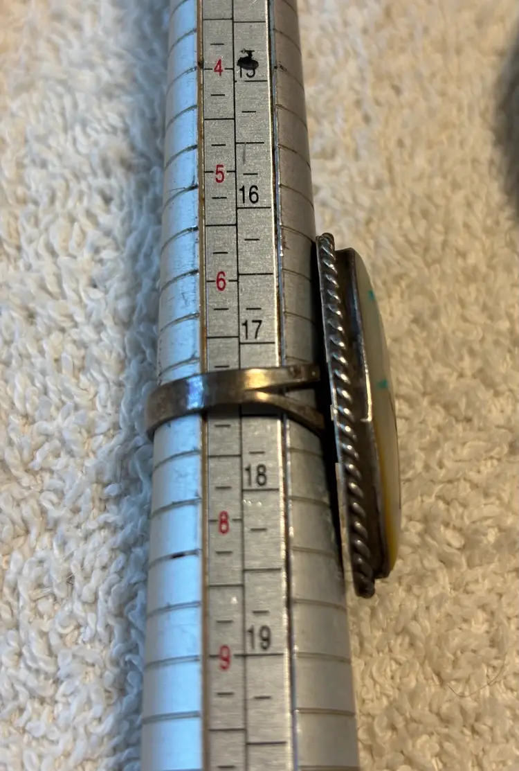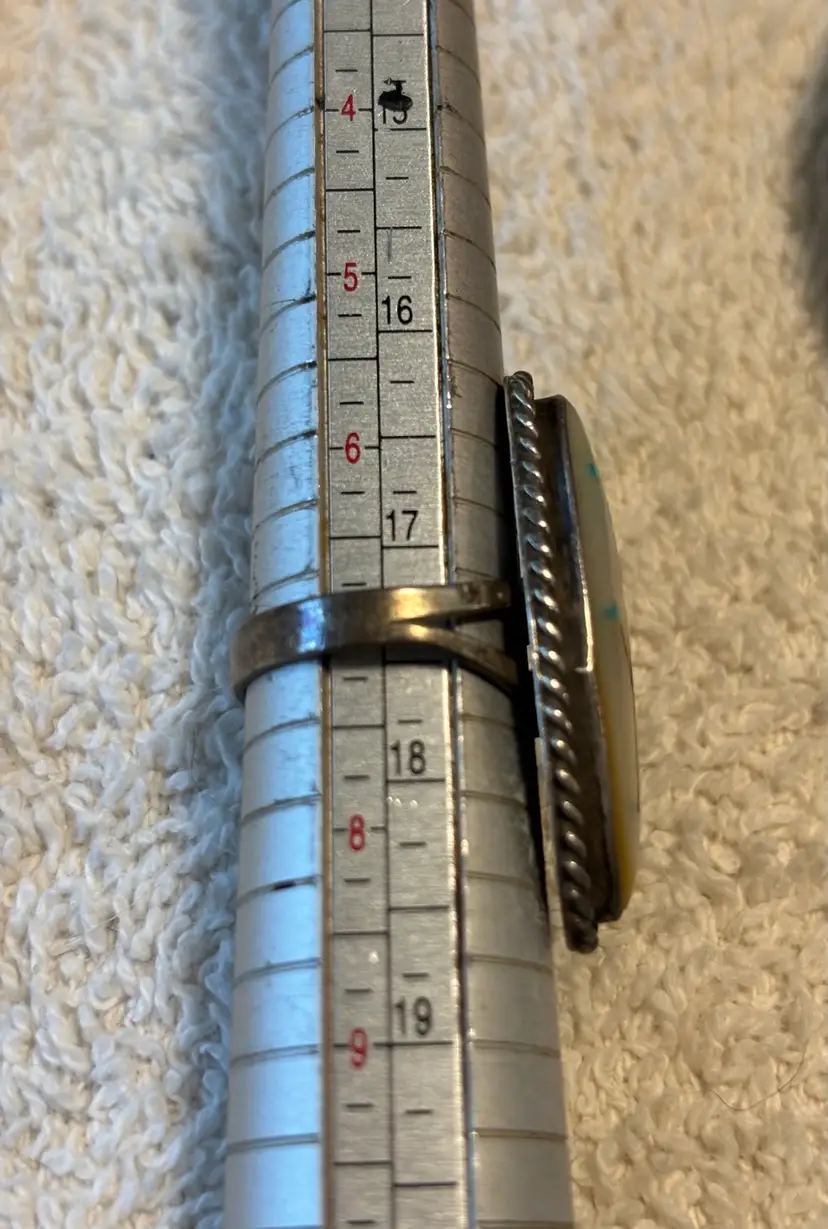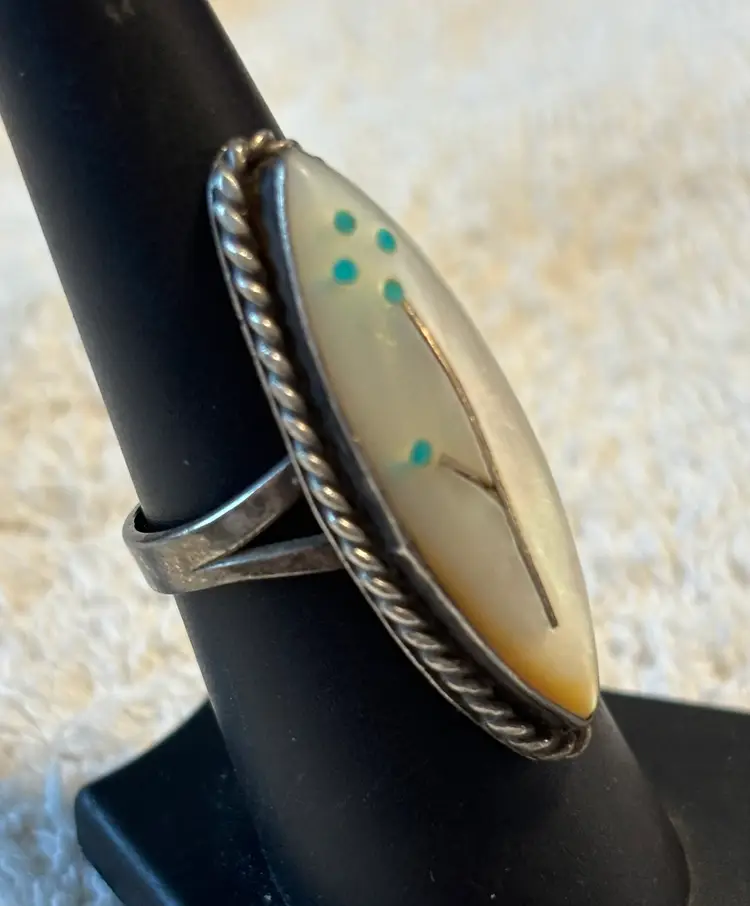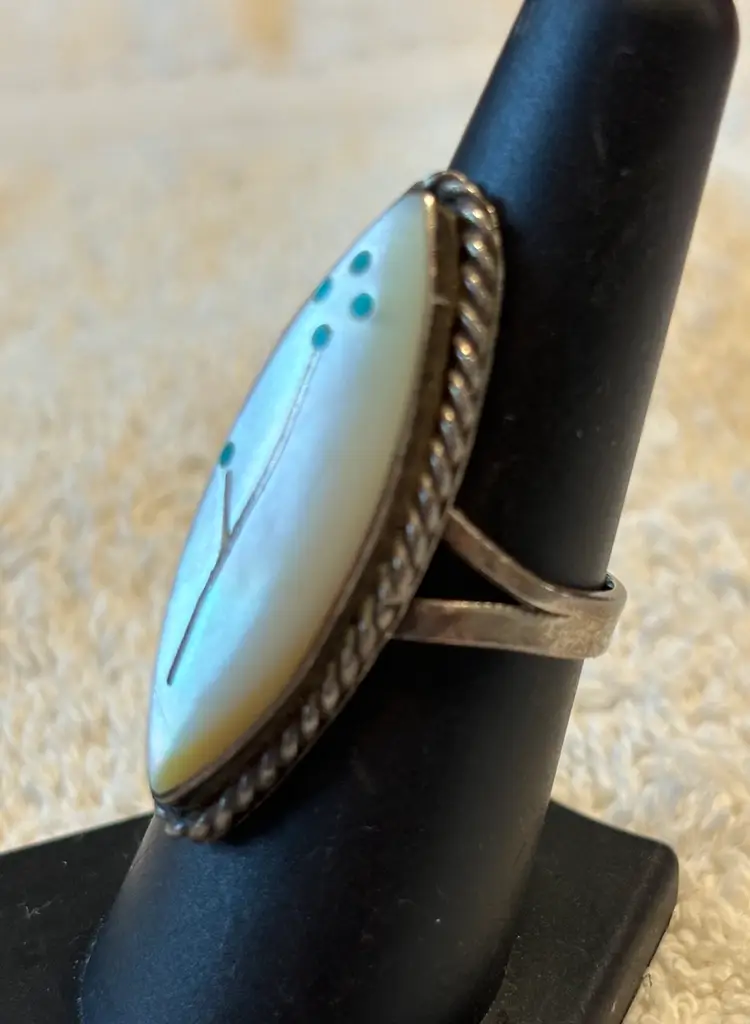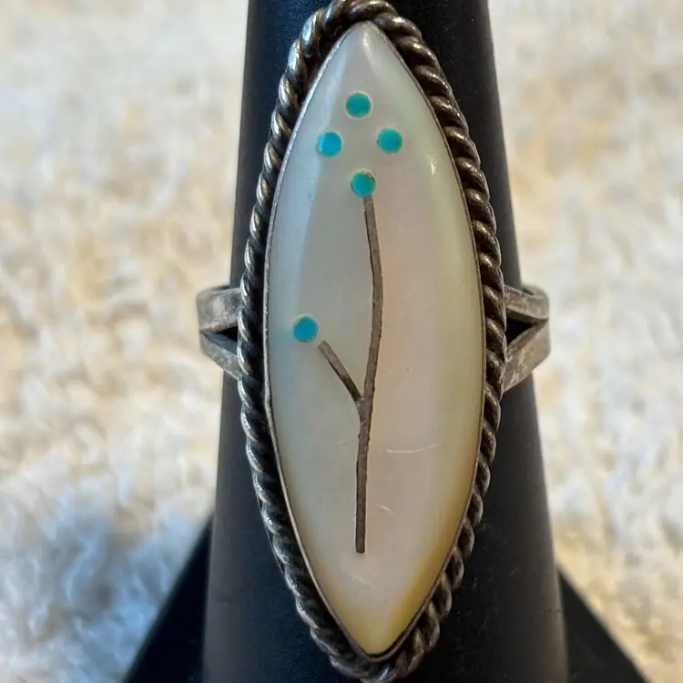 Sterling Sz 7 MOP ring with split shank. There’s a flower inset in the MOP with a sterling inset stem. Very Southwest style. No stamps or hallmarks noted. The metal has been acid tested and proven to be Sterling.