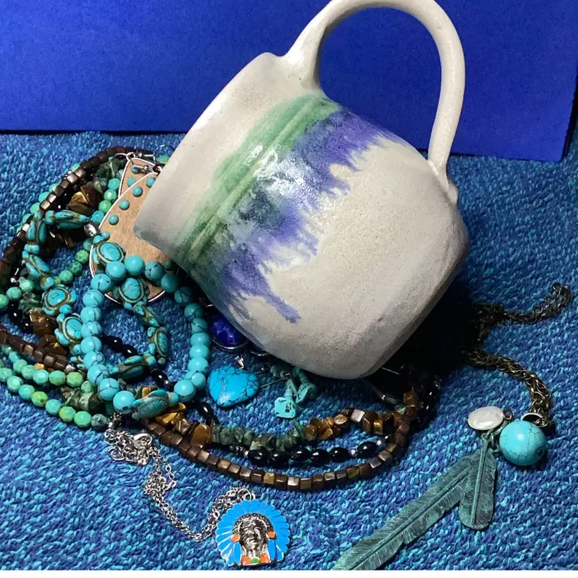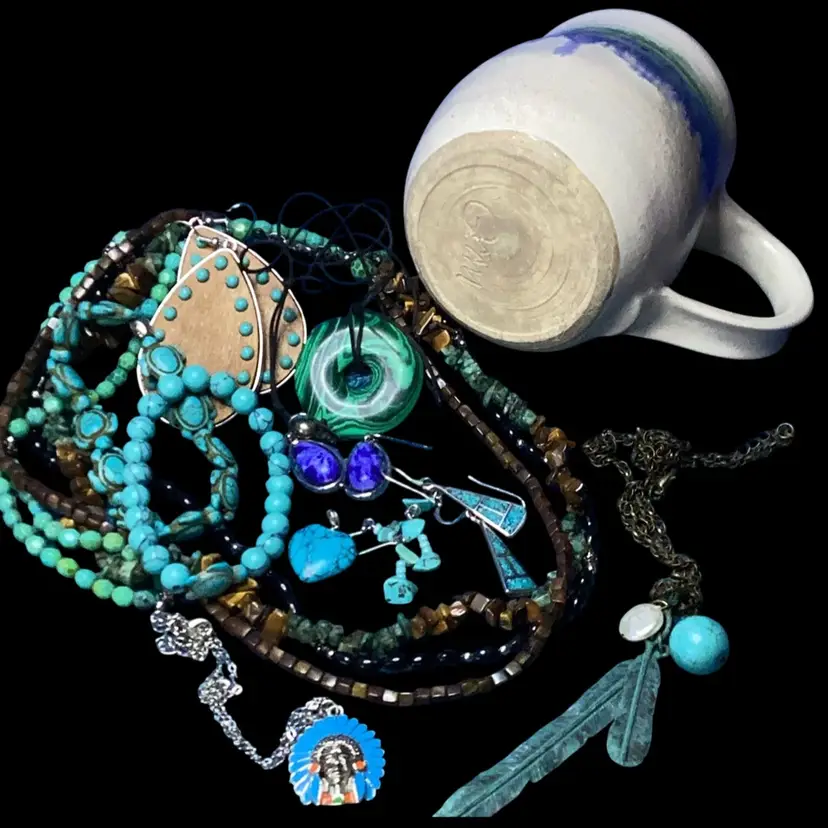 11 unsigned jewelry pieces malachite, howlite, tiger’s eye, turquoise chunks, faux turquoise natural stones. The mug is signed GMM hand thrown 10oz coffee cup.