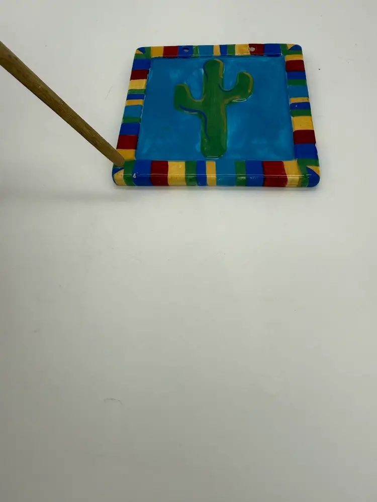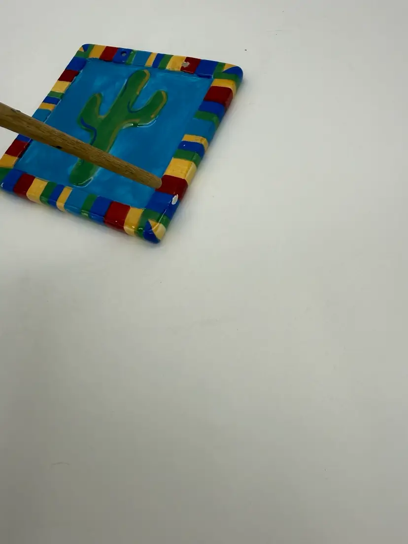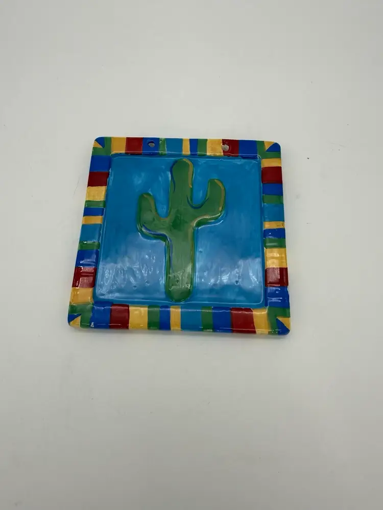 This set of 2 Southwestern hanging tiles features a Mexican folk art design inspired by the desert and cactus motifs. Hand-crafted from clay and ceramic, these abstract and rustic tiles are hand-painted with multi-color accents, giving them a glossy finish. Perfect for indoor or outdoor use, these decorative tiles can be displayed on kitchen counters, walls, or any room in your home. The unique design and vintage appeal make them a charming addition to any space with a Southwestern or art-themed decor. These tiles are in very good vintage pre-owned condition, however one of the tiles does have two very small flea bites on the right and bottom side of the edges, this can easily be touched up if desired. These do not come with hanging material. See pictures for details.