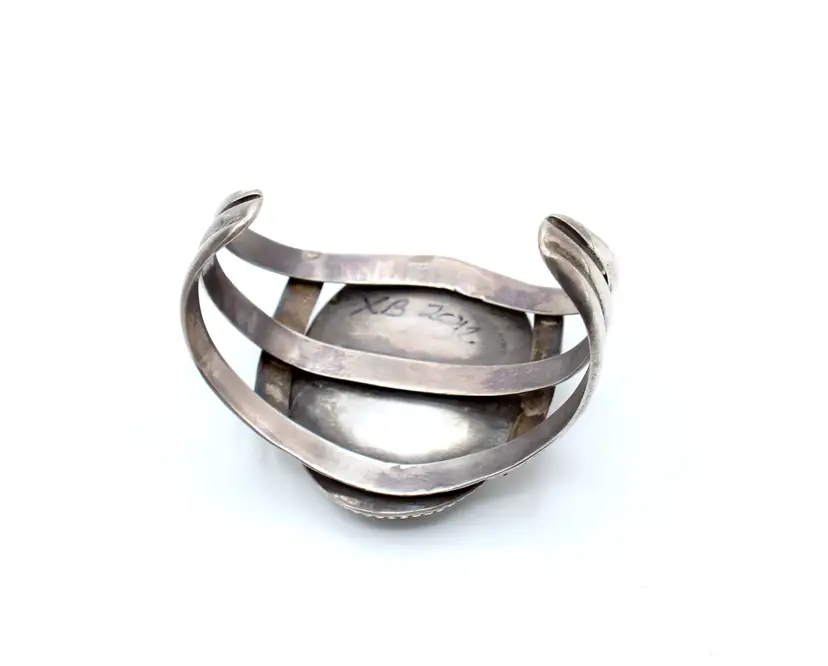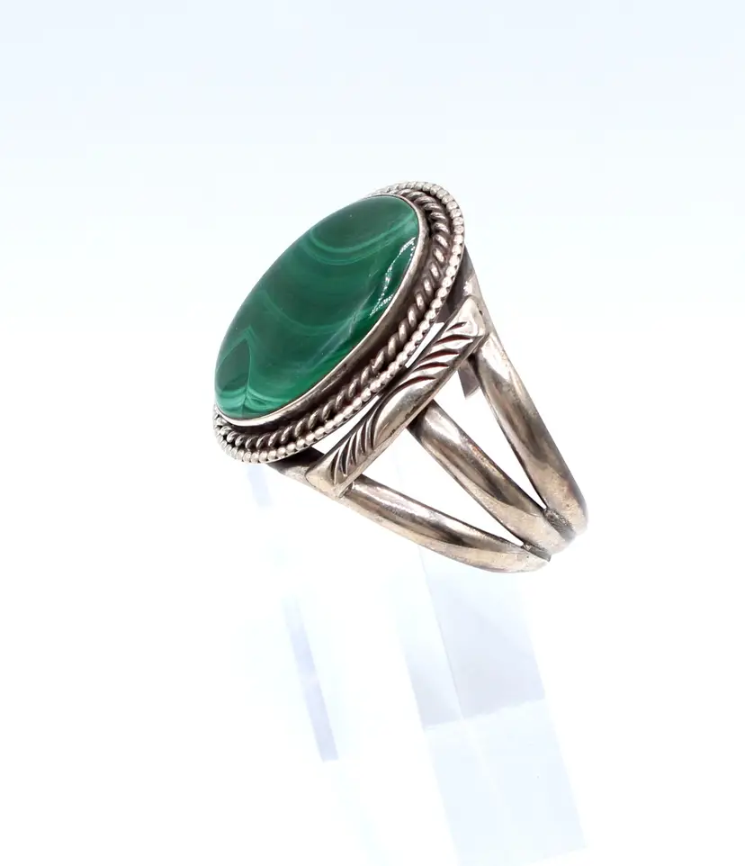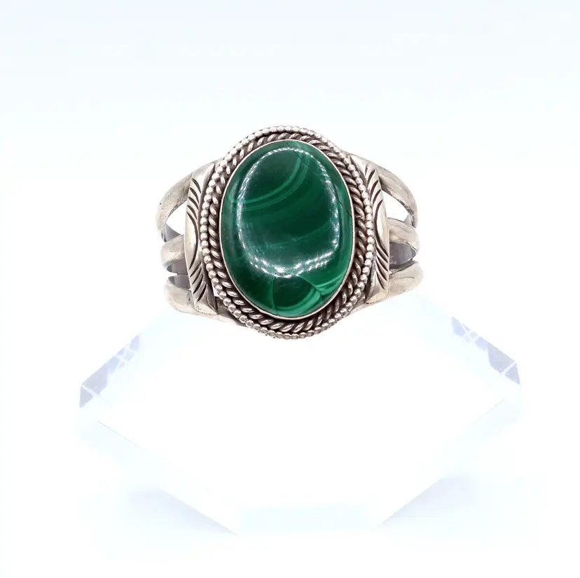 Stunning unsigned except writing XB 2012 believed to be Navajo heavy gauge 3 shank malachite cuff. The malachite set in a smooth bezel with twisted rope and dot design for accent. Stamp work on cross bars of the 3 shank cuff. Inner diameter 5" gap 1 5/8", 2" wide.