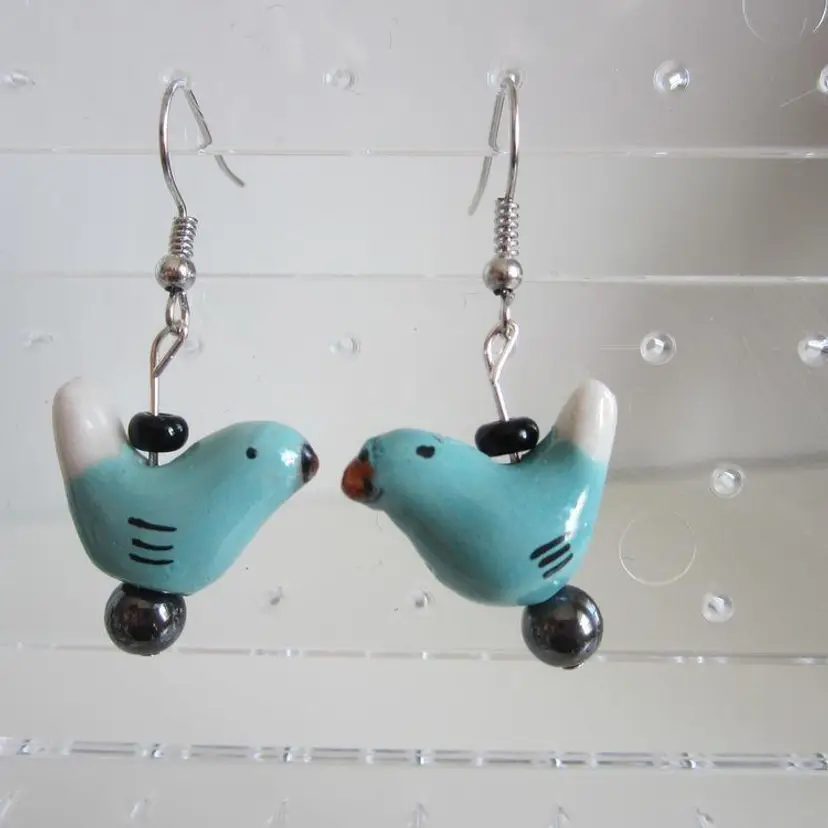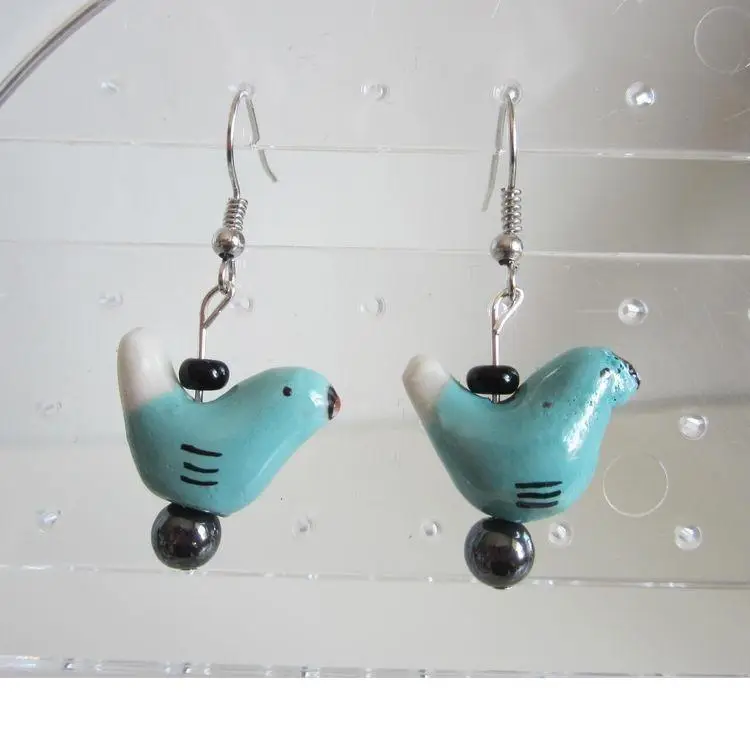Southwestern pottery bird earrings with Hematite beads. Each little bird looks different because these are handmade. The earrings measure 1 5/8" x 7/8".