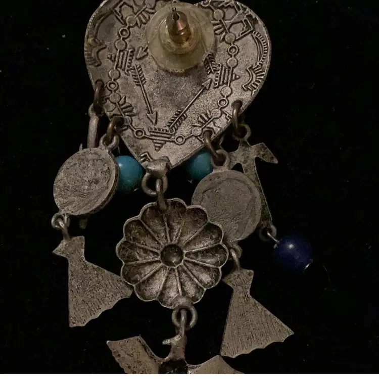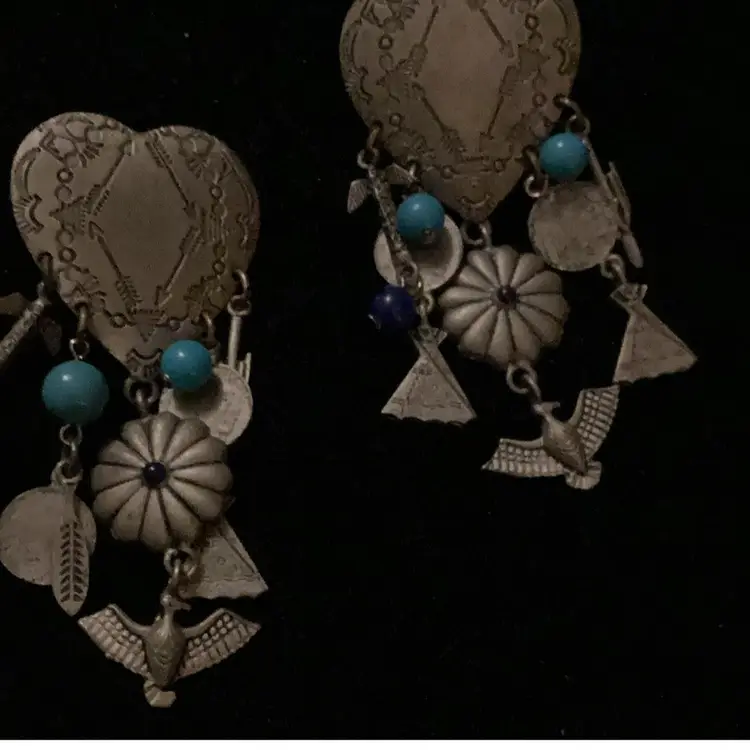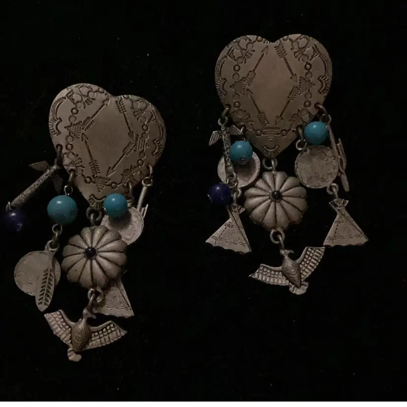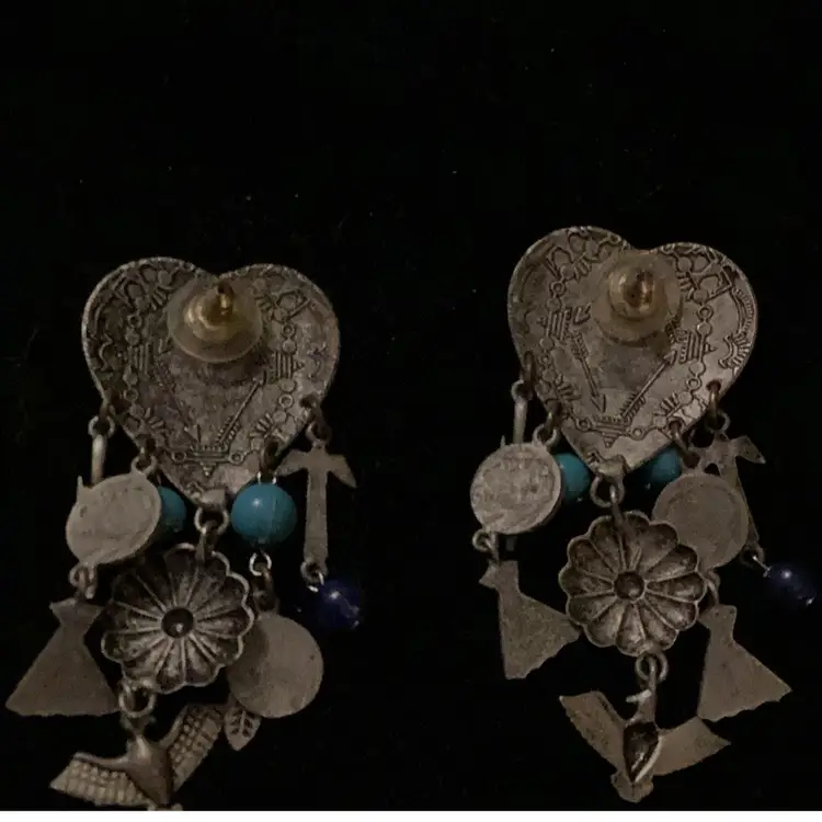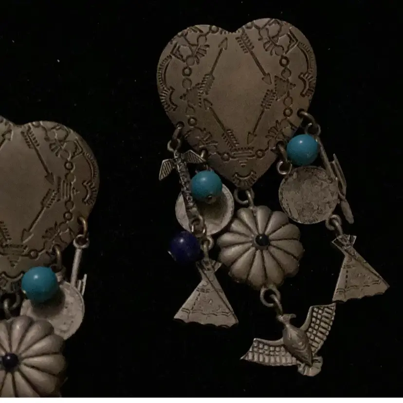 Southwestern style engraved heart earrings with beads hanging off the hearts we have a TP turquoise style beads, a cactus TP and an eagle an arrows that are engraved onto the heart. See I did put new backings on them so the backings are new.