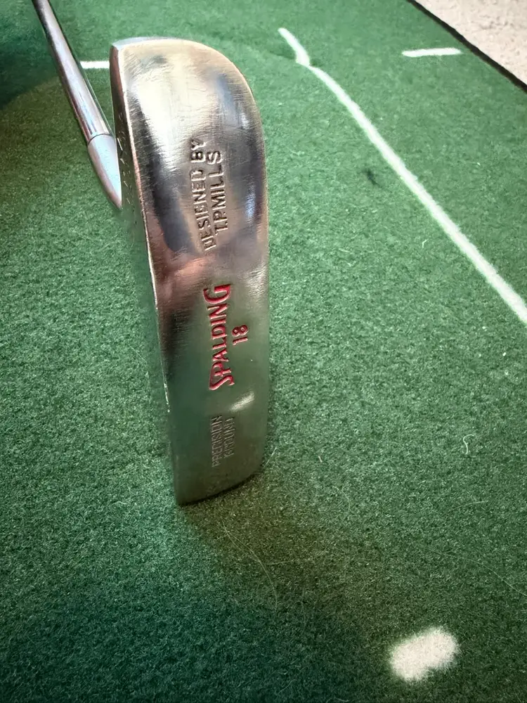 Right hand refinished stainless Spalding TPM 18 tour series flow neck putter. Has been cleaned up and refinished. Was pretty rough when I got it so I deburred and polished. Has a torched cavity and cleaned up paint fill. 35” length and has brand new Bettinardi Tiki grip.