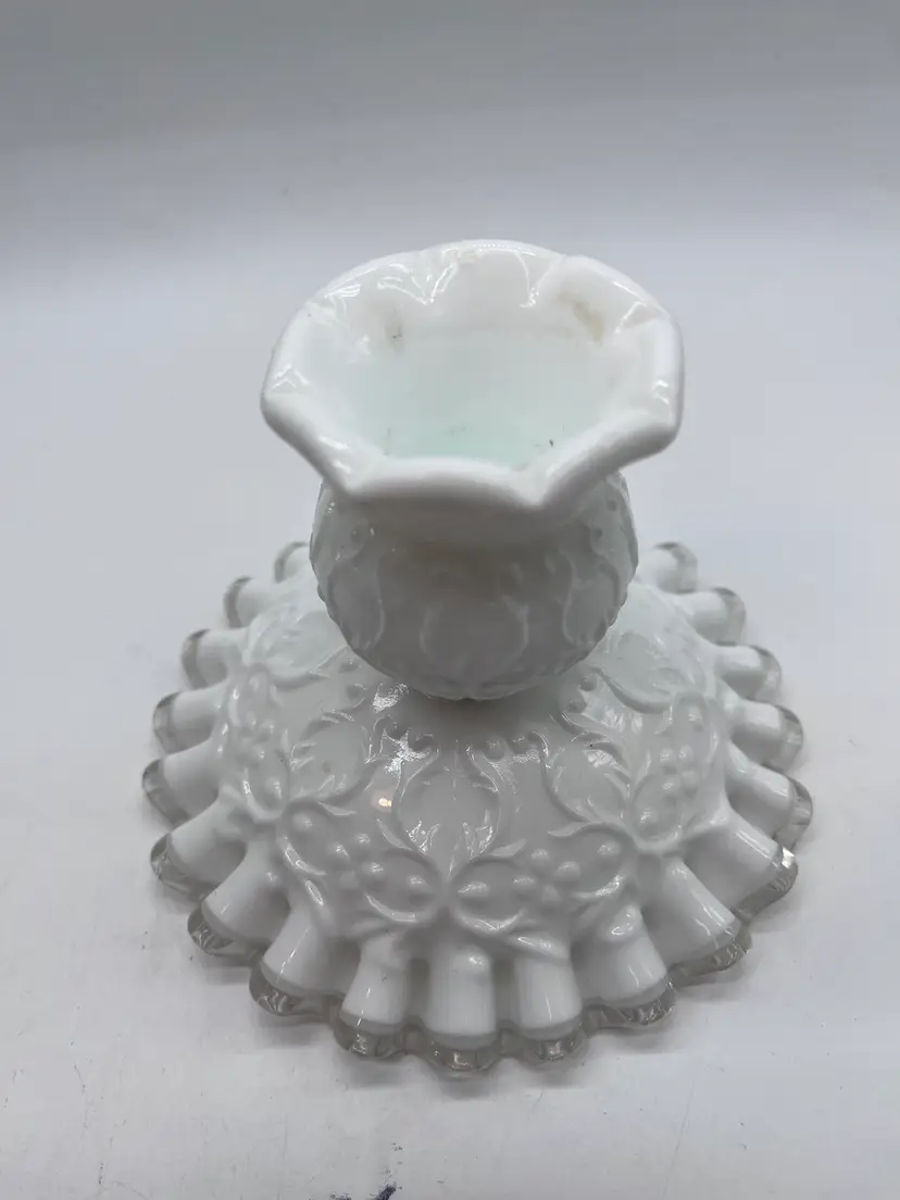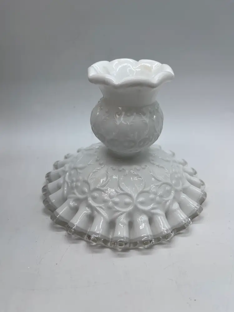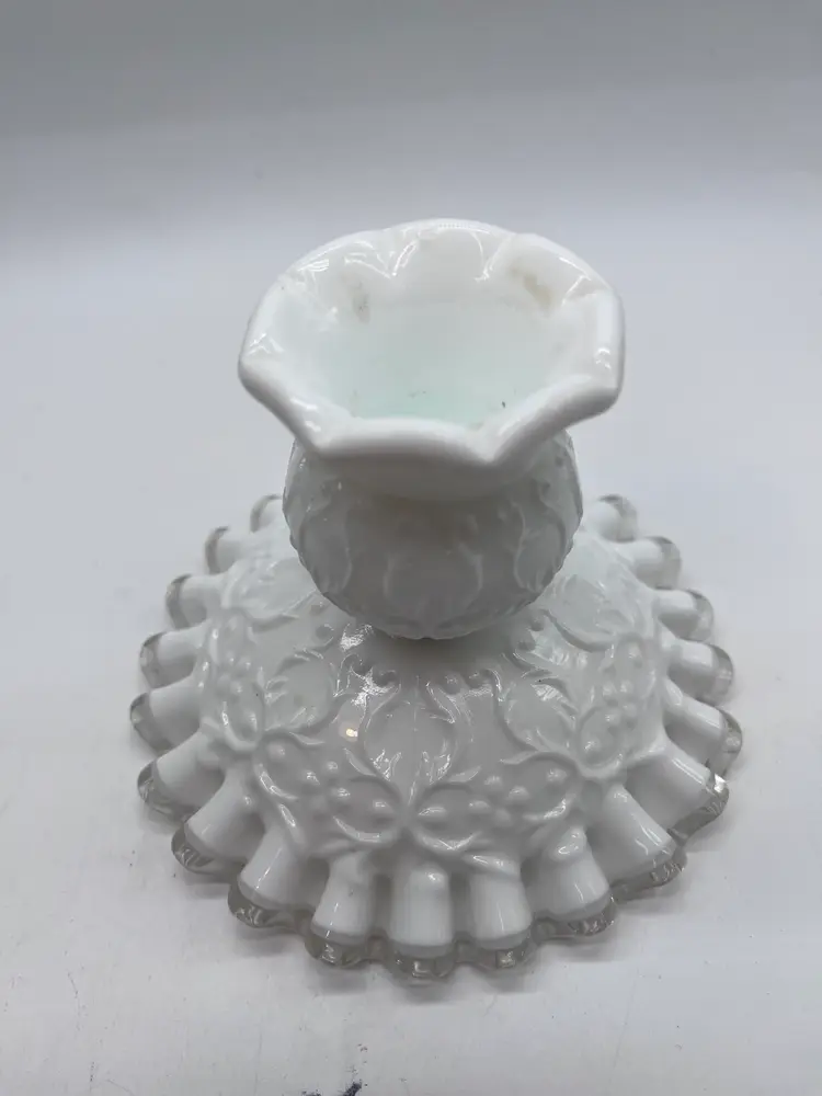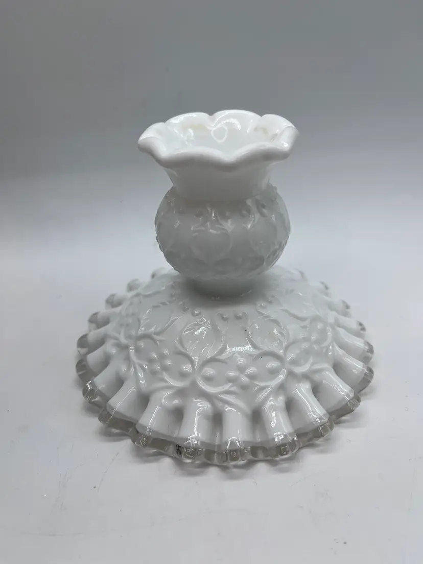 Proudly made in USA, Fenton glass is not only highly collectible but durable, functional and pretty! This gorgeous candle holder is decorated in the Spanish Lace pattern, on the very popular Silver Crest ruffle base design.