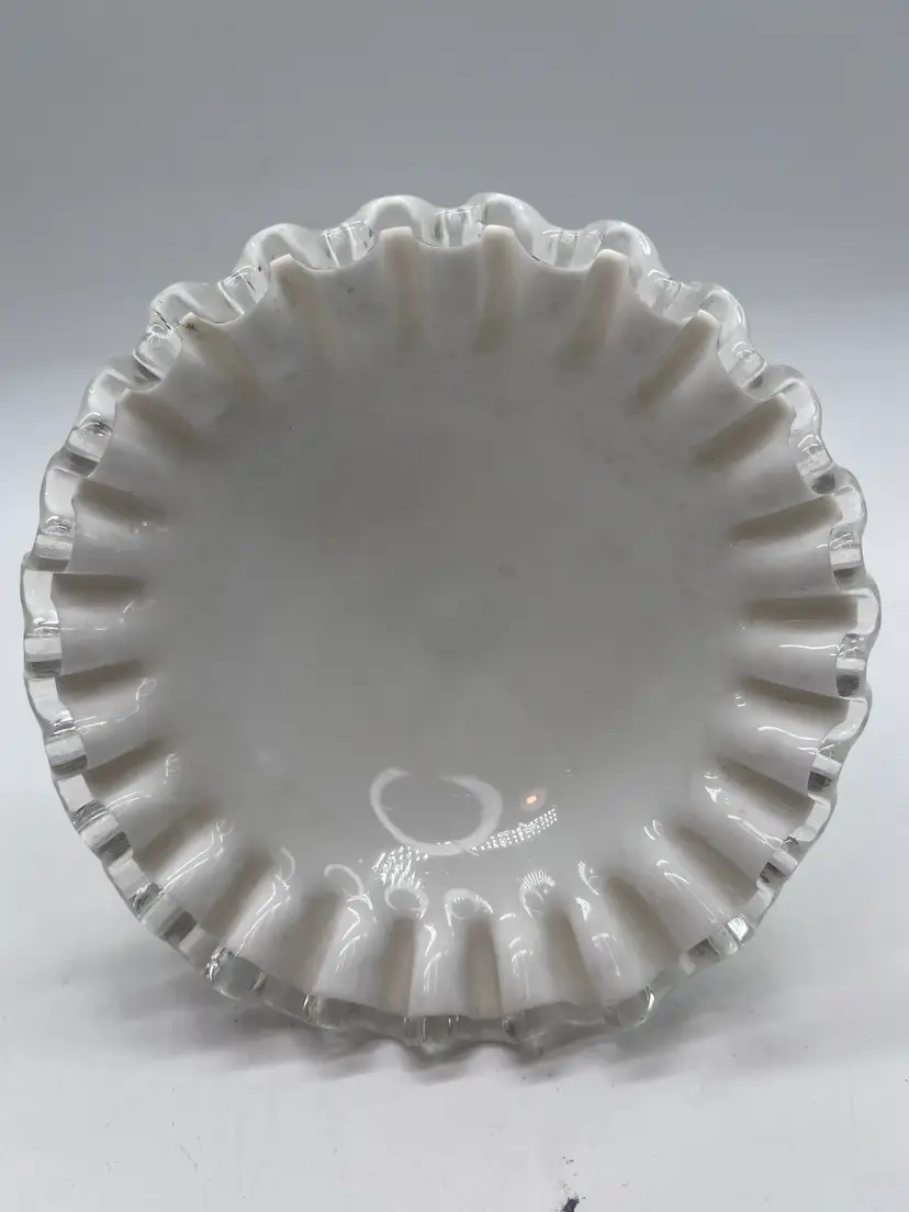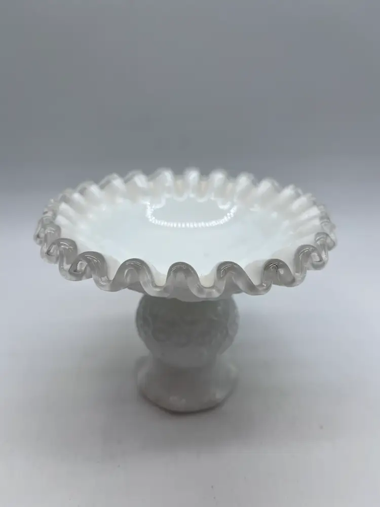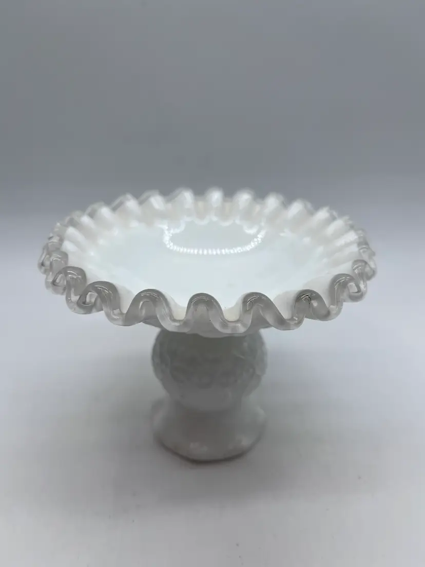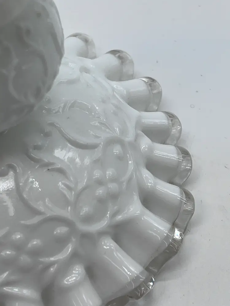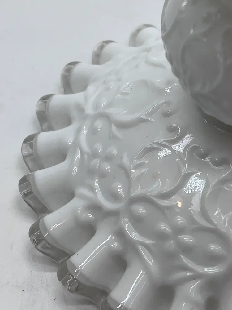 Proudly made in USA, Fenton glass is not only highly collectible but durable, functional and pretty! This gorgeous candle holder is decorated in the Spanish Lace pattern, on the very popular Silver Crest ruffle base design.