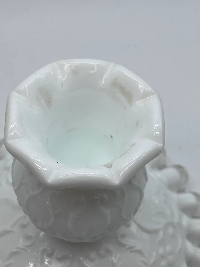 Measures 4” high on a base that is 4.75” wide. It is in fine pristine condition, with no chips, cracks or damage. A wonderful addition to a milk glass display or for everyday use, and ships from a smoke free pet free home.