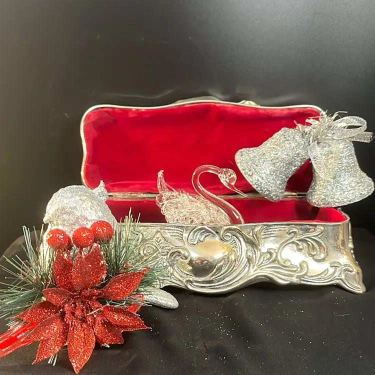 Includes Silver Plated and Red Velvet lined jewelry casket, Silvestri Swan Ornament, Pair of vintage bells, Glitter Bird w/ red poinsettia AND ASK to see what is lurking in the bottom! Complete vignette pre shipping wt approx