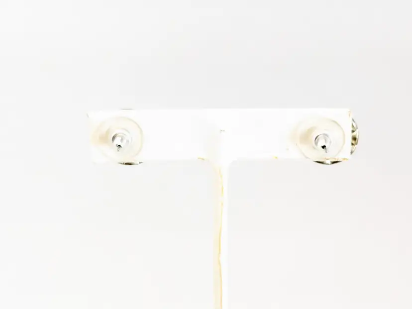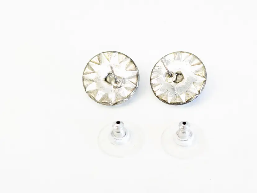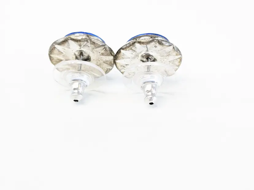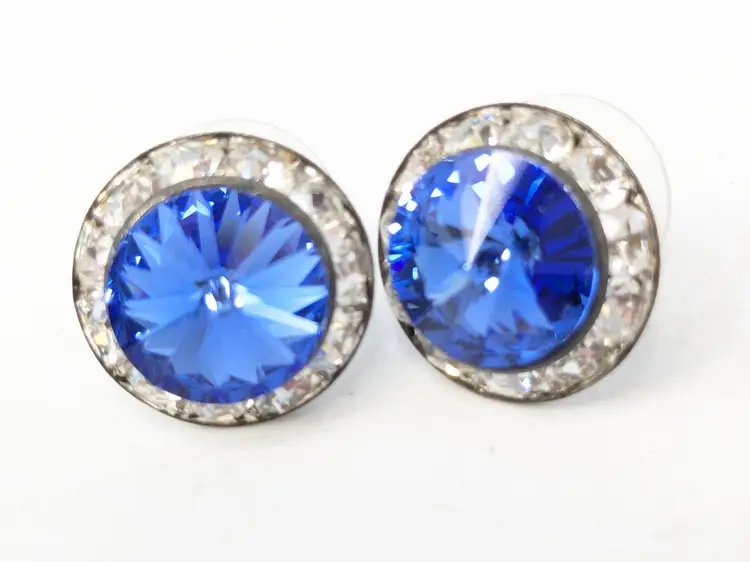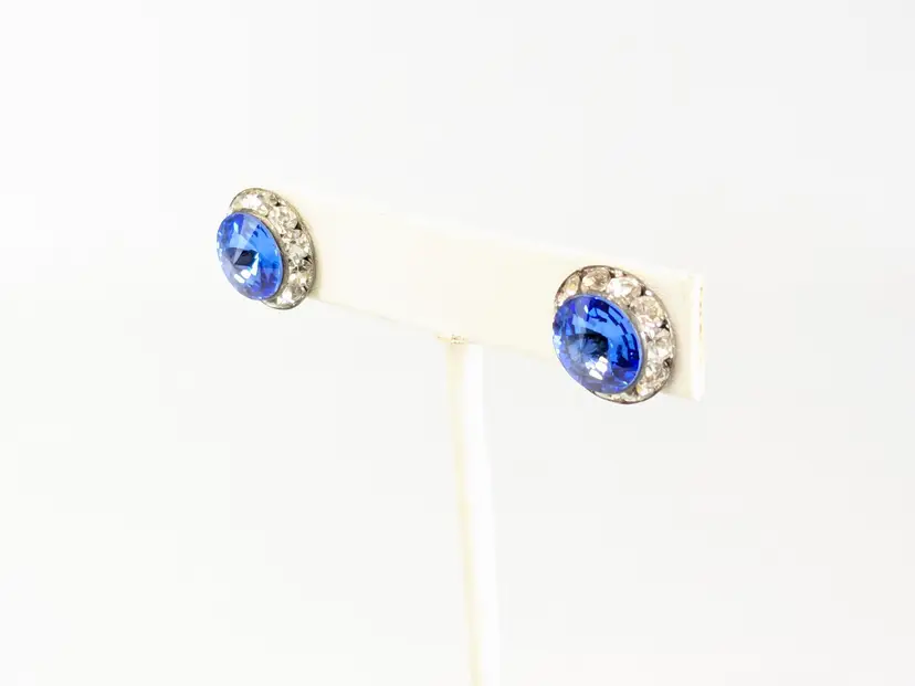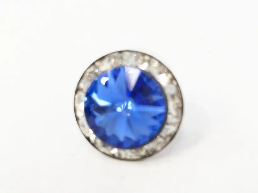 Good condition. Stunning blue crystals surrounded by clear accents. Silver Tone. Measures 1/2". EN2