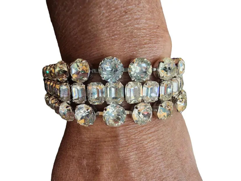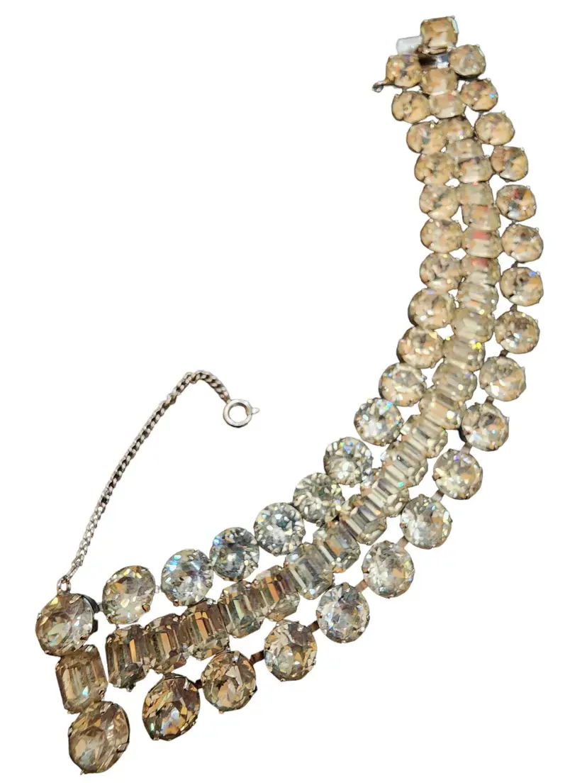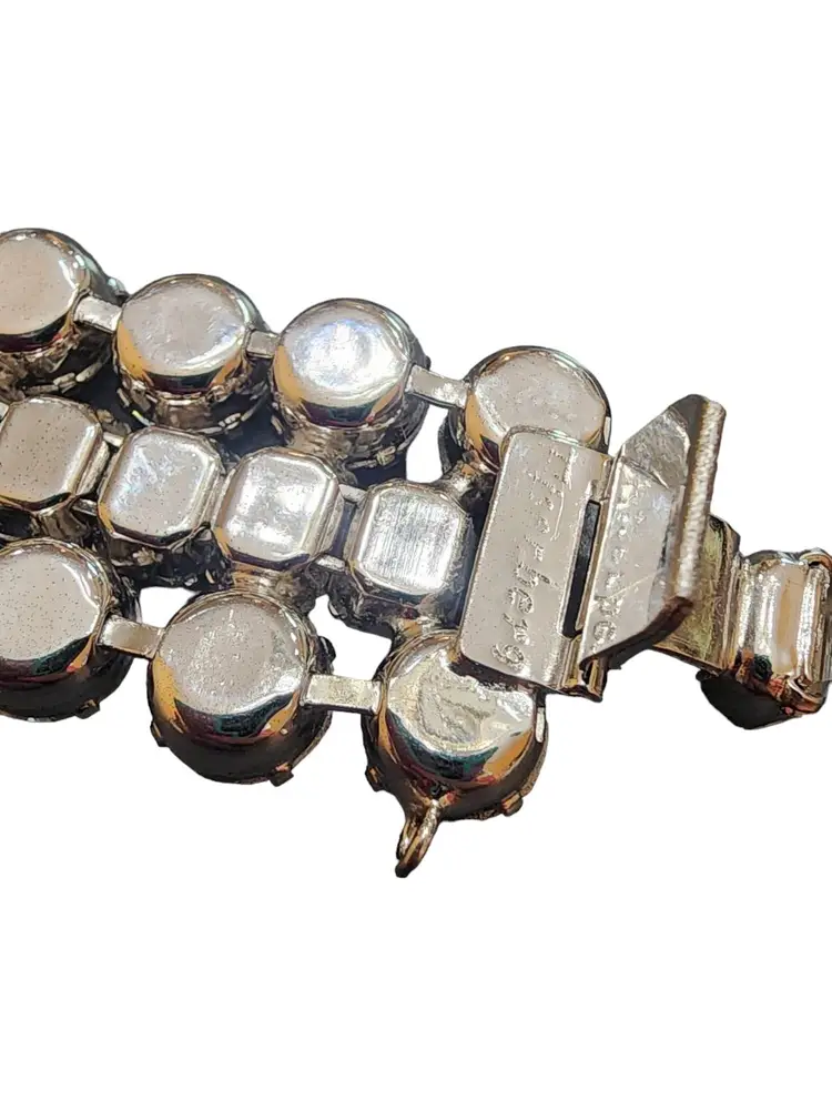 Size: 7" long x 1" wide Color: Clear Condition: Very good vintage Signed: Eisenberg Details: This sparkles like crazy, safety chain, rhinestone push clasp.