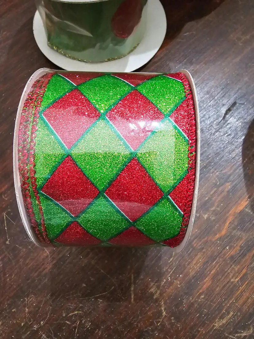 Eye-catching ribbon with a glittery red and green harlequin pattern. Ideal for holiday crafts, gift wrapping, or festive decor.