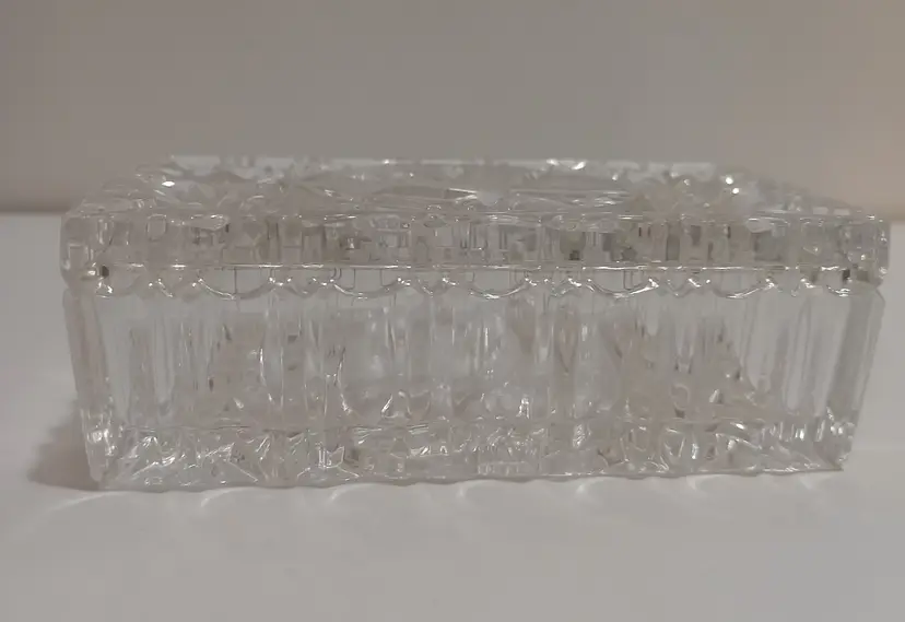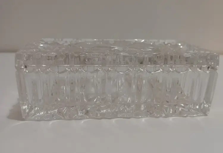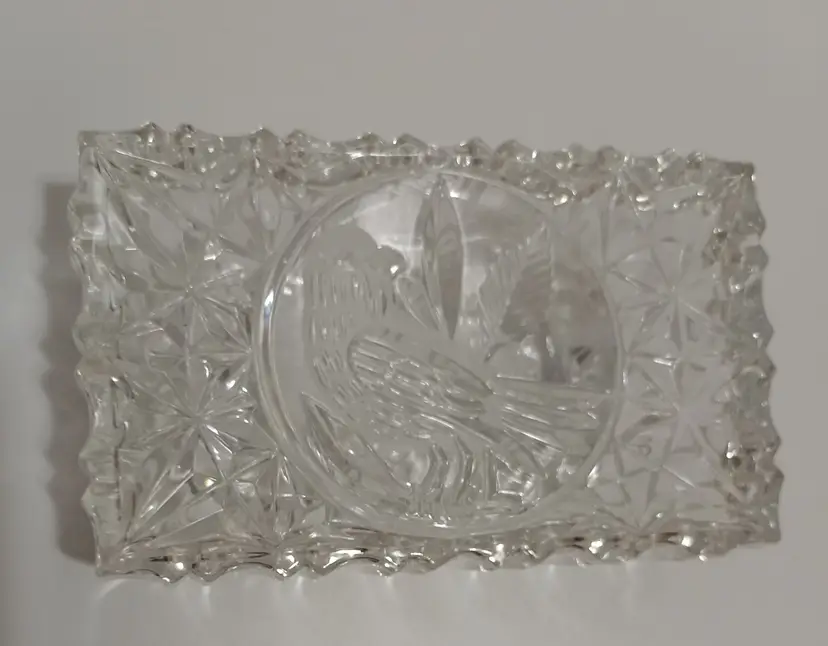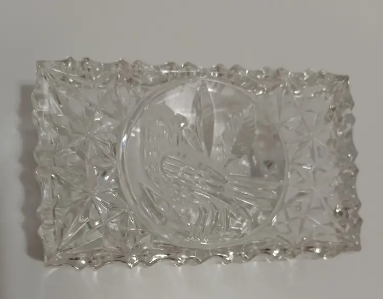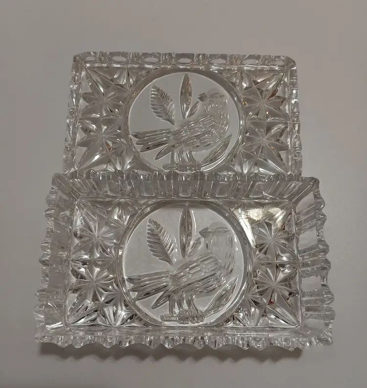 Lovely Cut Glass Trinket Dish with Bird Carved into the Lid and the Bottom of the Base; 5" L x 3" W x 1.75" T; Nice Condition! Shows Very Minor Wear; Non Visible Flea Bite Near Inside Corner of Lid