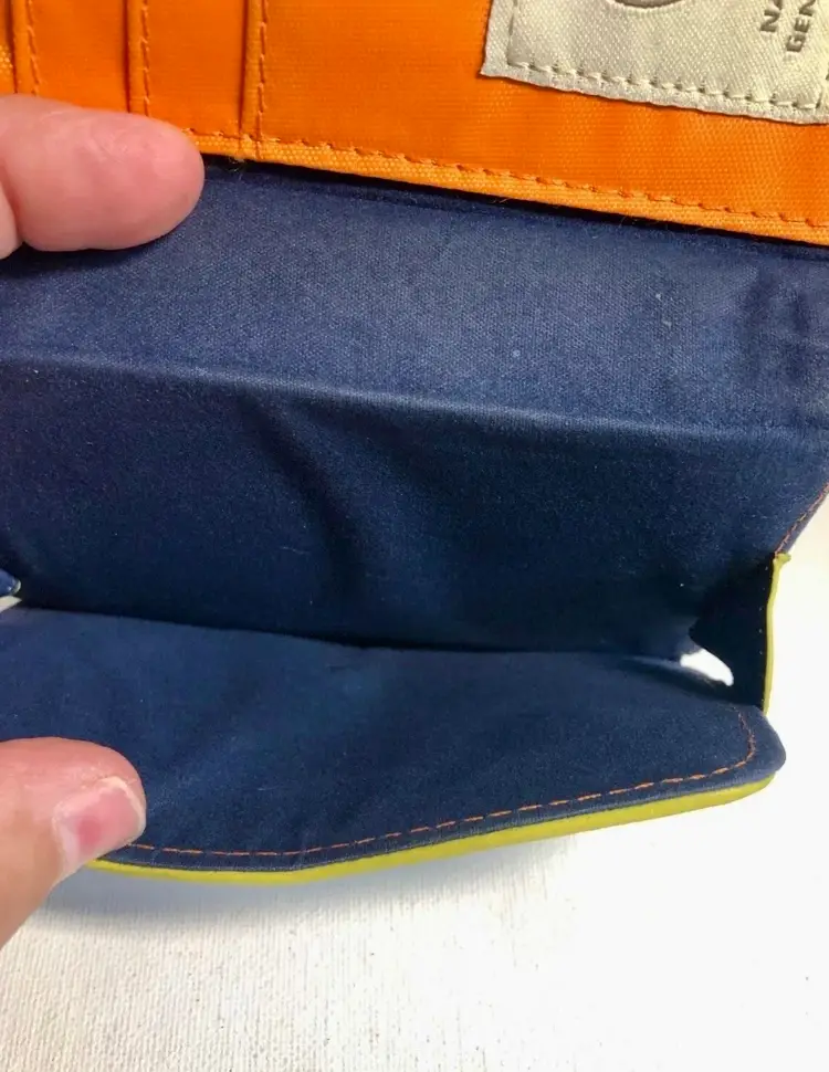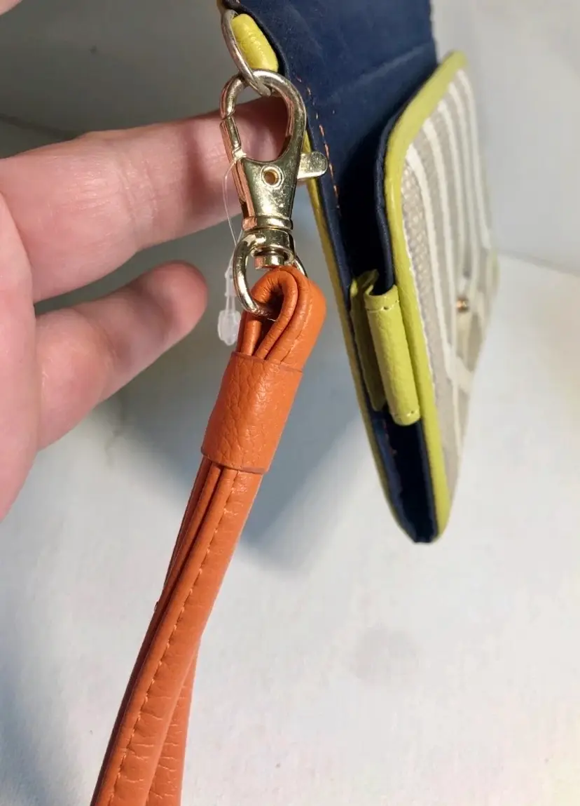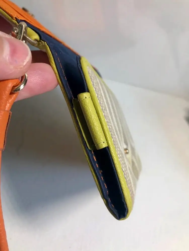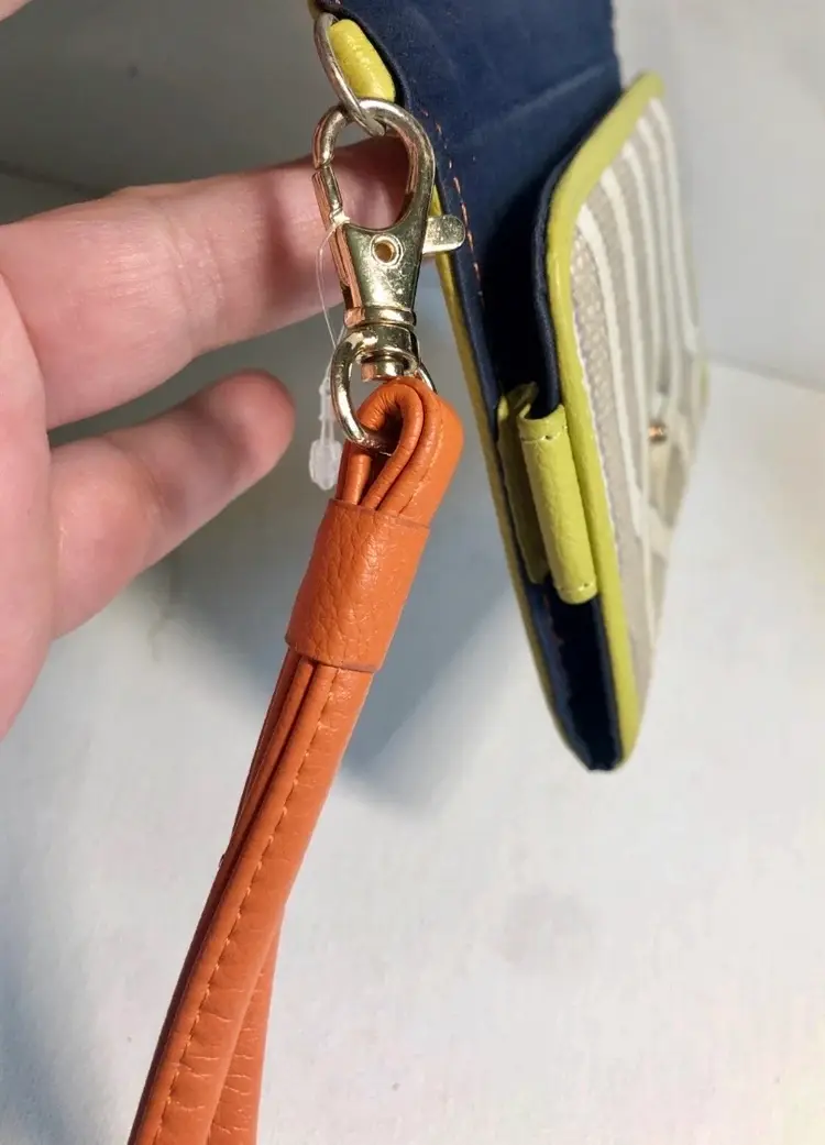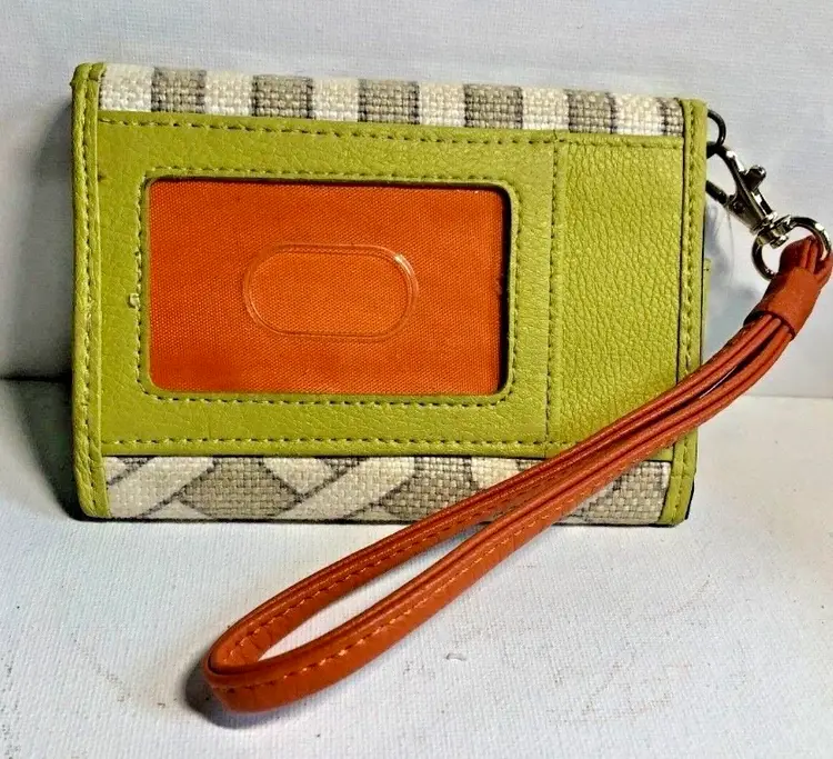 Very nice Spartina #449 Veranda wallet wristlet. Discontinued geometric: Serendipity - Veranda with lime green and orange leather accents and navy cloth interior. Snap closure opens to include credit card slots and slot for money. Includes leather removable wristlet strap.