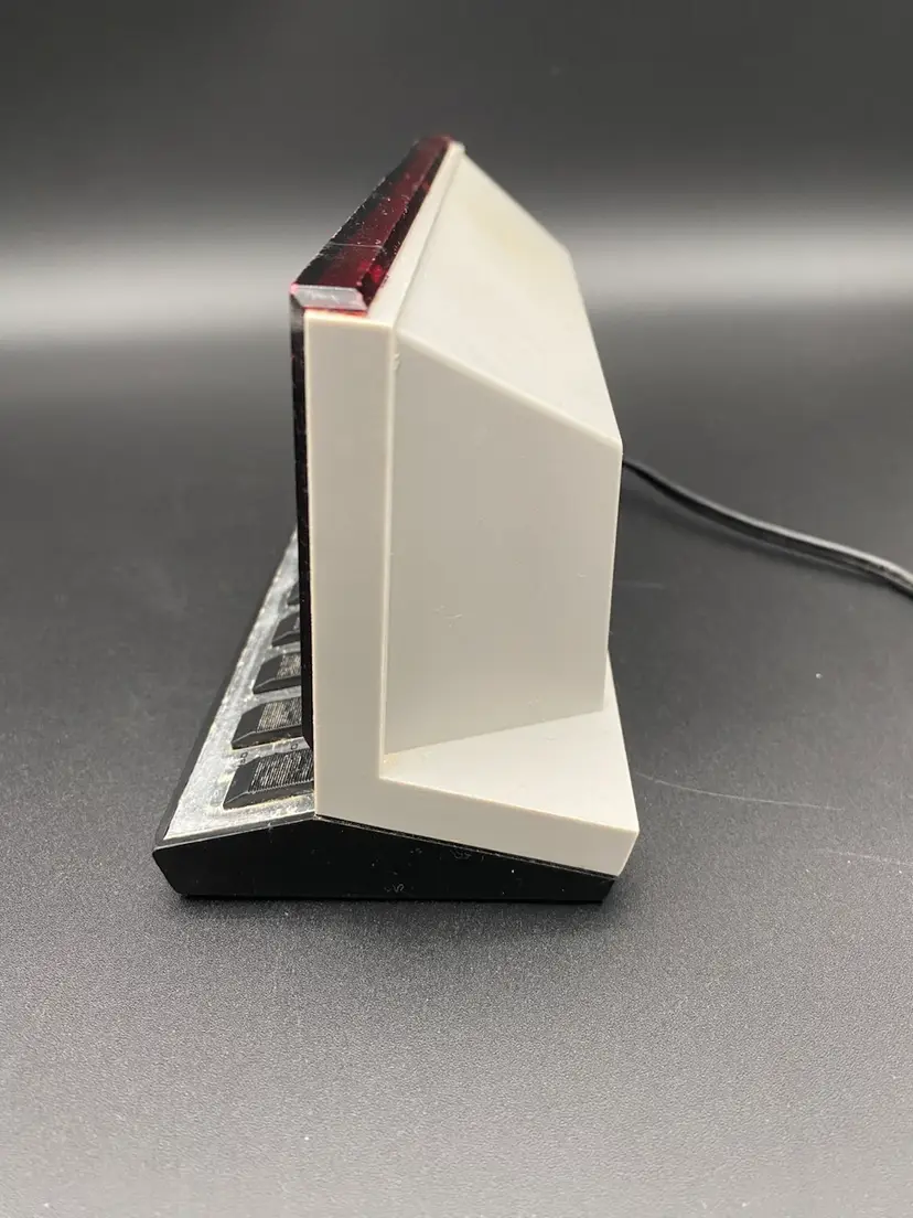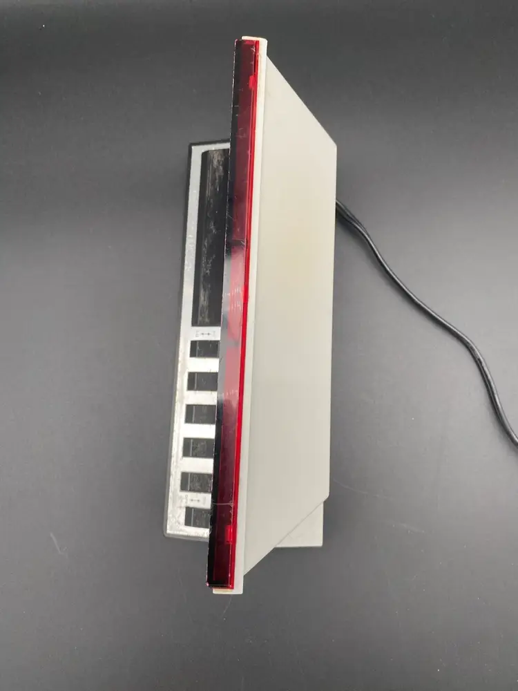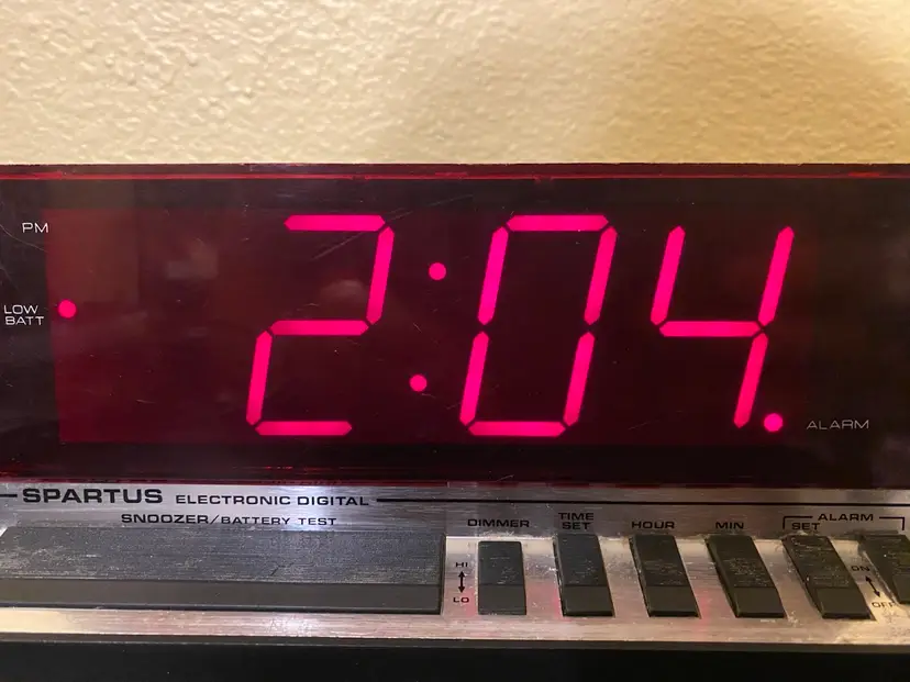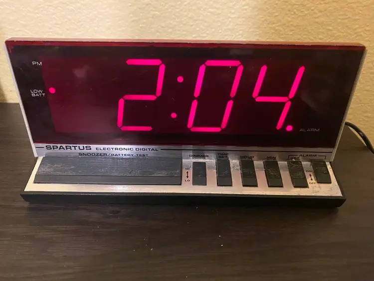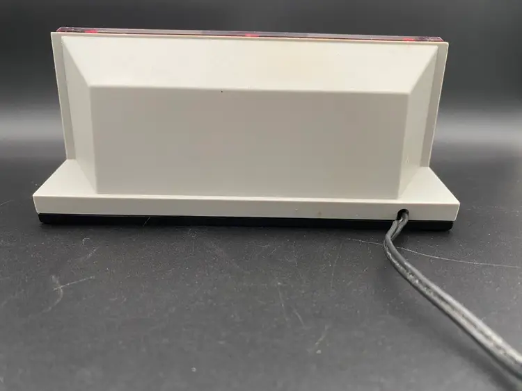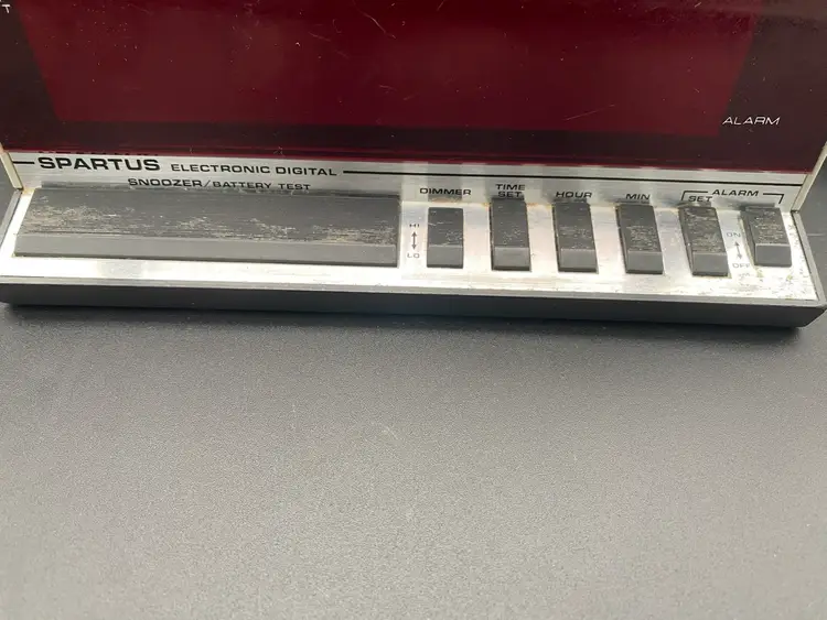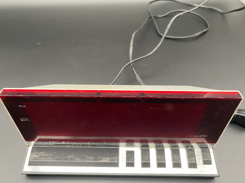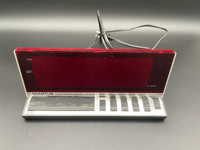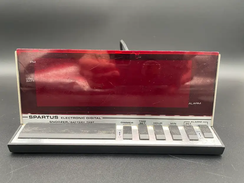 You are purchasing one Silver w/ Red Display Electronic Digital Alarm Clock by Spartus. This Unit is around 8.25 inches wide and 4 inches tall. This Clock is in overall good condition with no chips or cracks in the material, no issues with the Digital Display and no fraying of the Cord. See final two images for slight scuffing along the top front edge and areas that will need a more fine-tune cleaning. Clock and Alarm features are in tested working condition - need to press on Snooze button firmly.