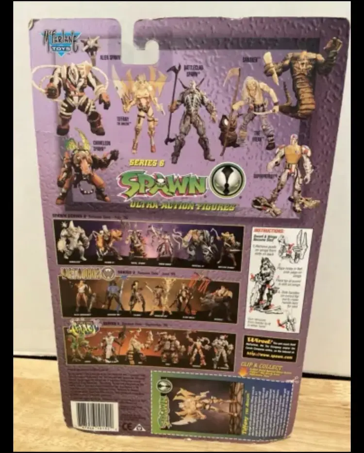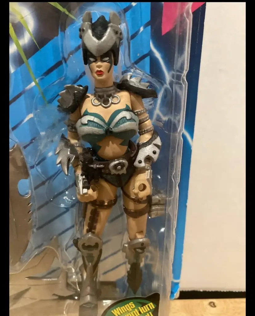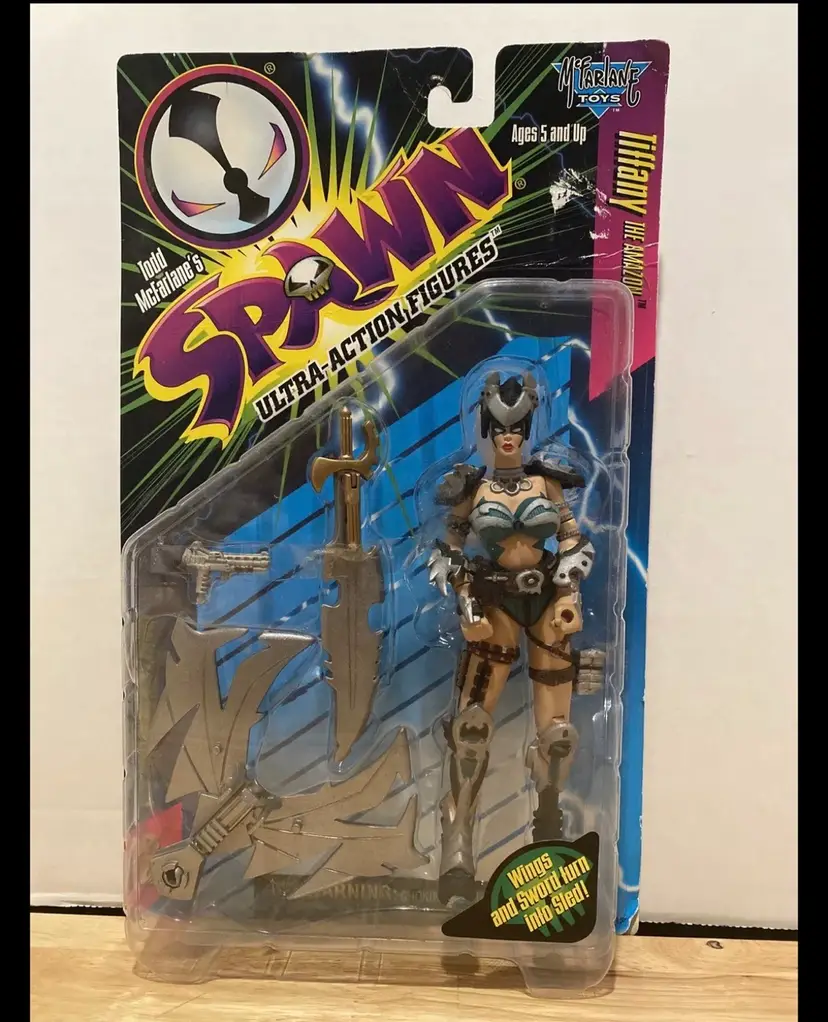 The product is a vintage 1996 McFarlane Toys action figure of Tiffany the Amazon from the Spawn franchise. Standing at 7 inches tall, the figure features a green color variant and comes in its original packaging. Tiffany comes with wings and a sword as accessories, making her a highly detailed and collectible piece for fans of comic book heroes. This original action figure is a nostalgic reminder of the popular characters from the 1990s era of Spawn