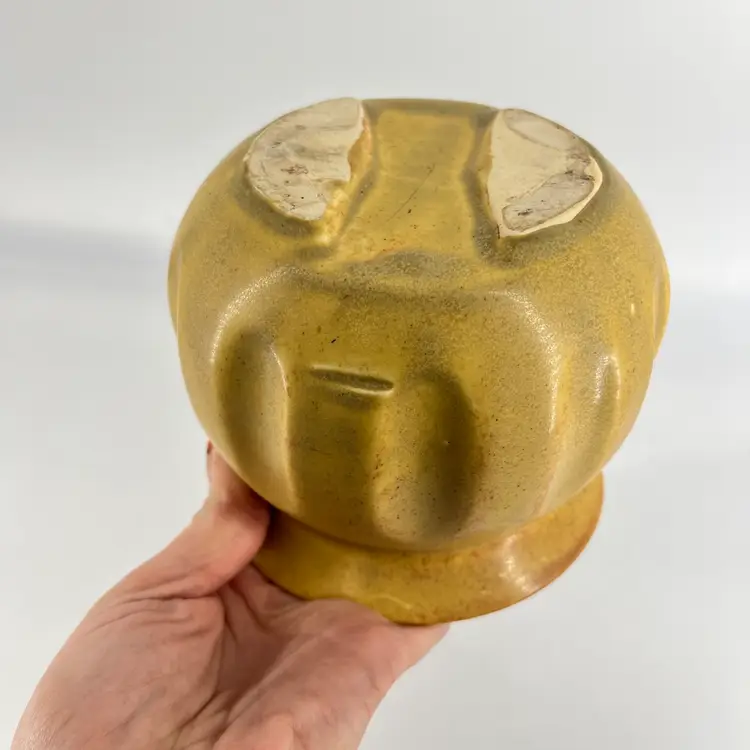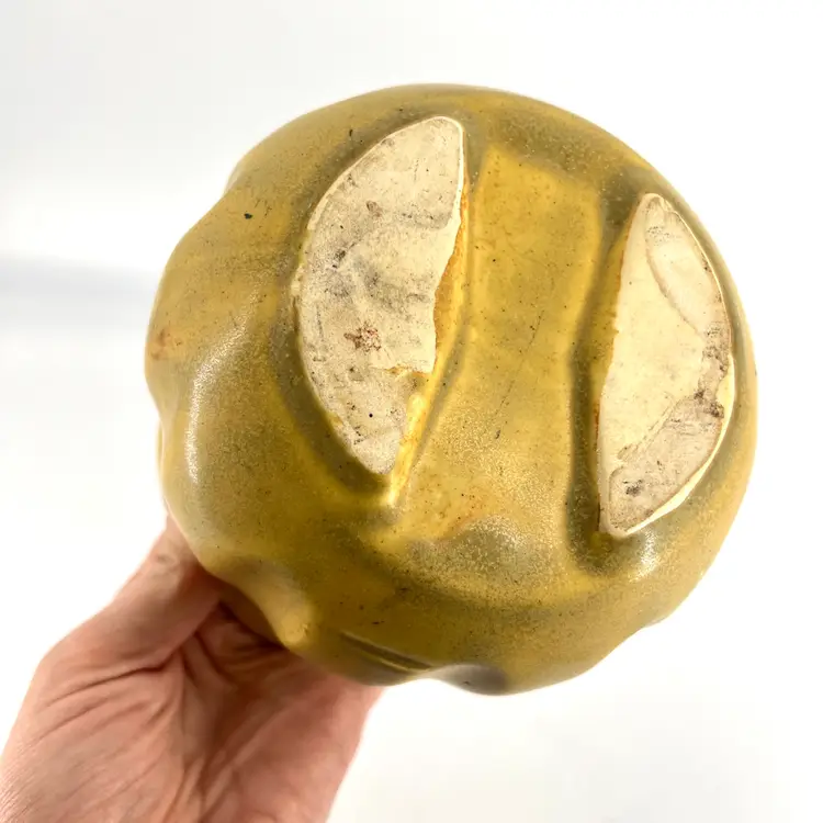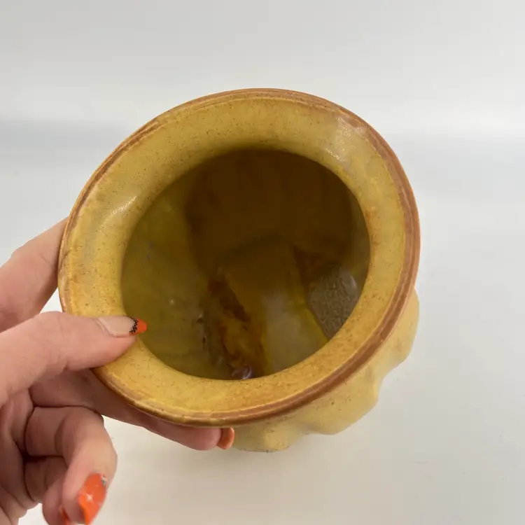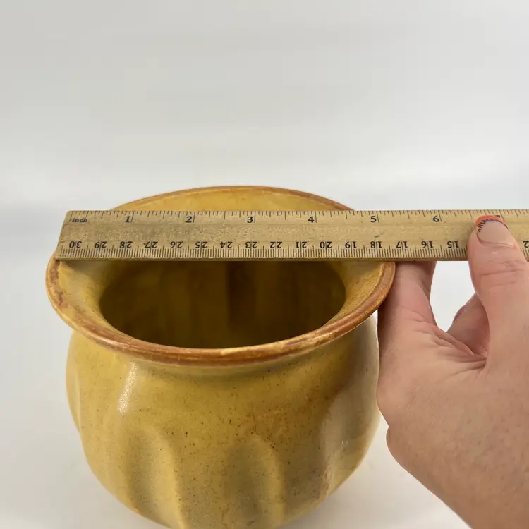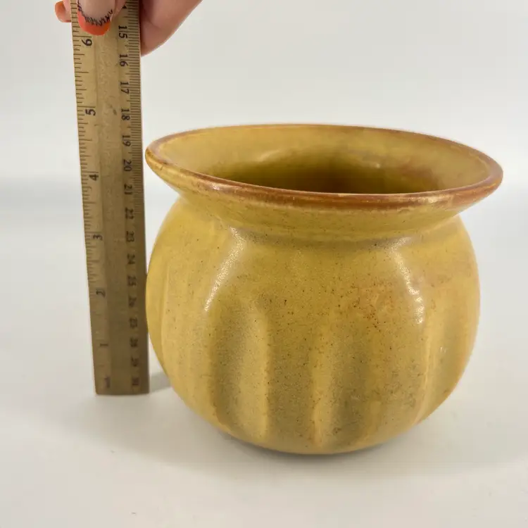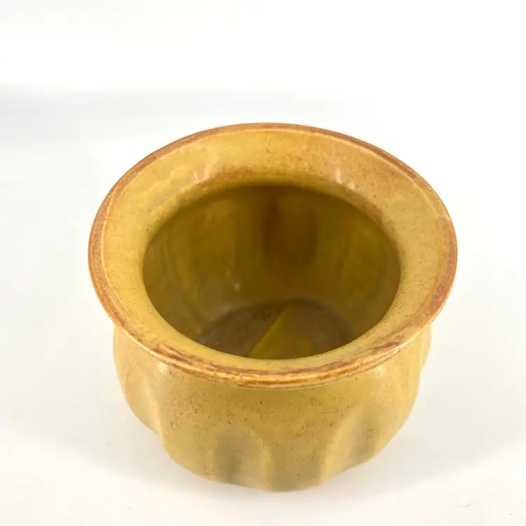 This flower pot has ribbed design and flared lip. It has a dark yellow tone with speckles. There are no markings or signatures, but it's presumed to be made in the USA. It measures approx 4.5" tall and 5" wide at the opening.