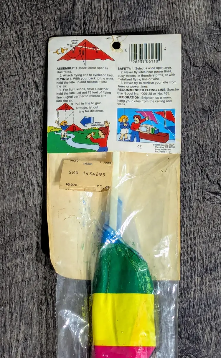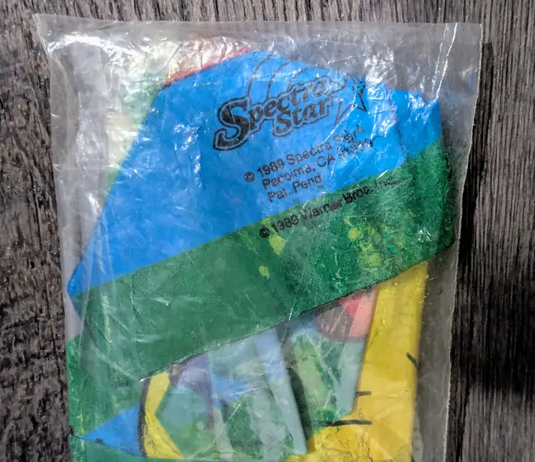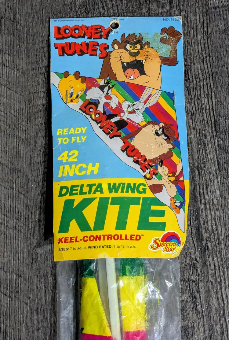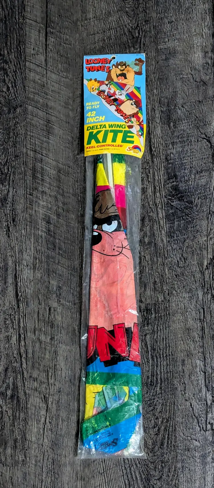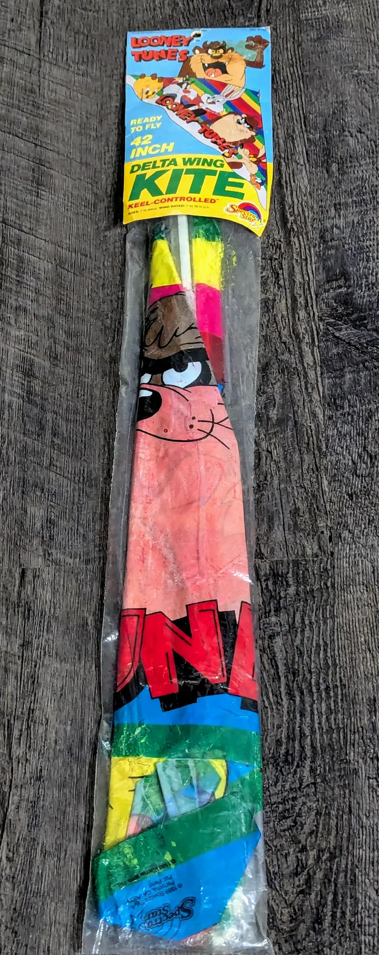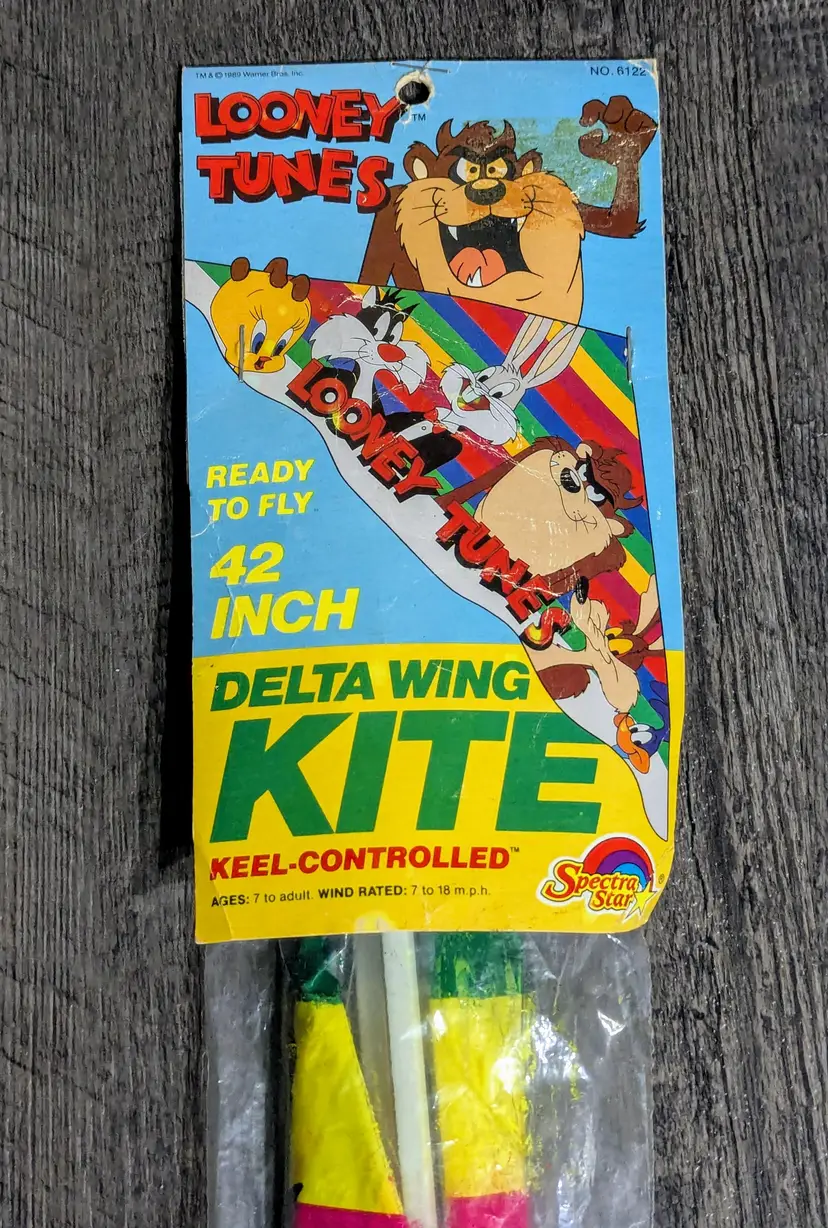 This listing is for a vintage new old stock Spectra Star 1989 Looney Tunes Kite. It's never been opened but it features Bugs Bunny & Tasmanian Devil that I can see. Really cool collectible perfect for any Looney Tunes collector.