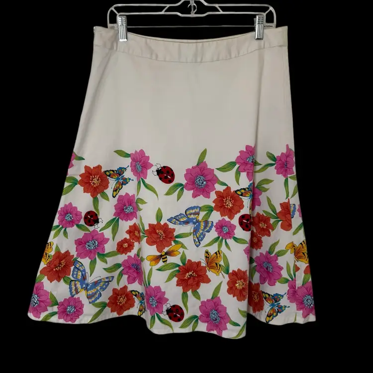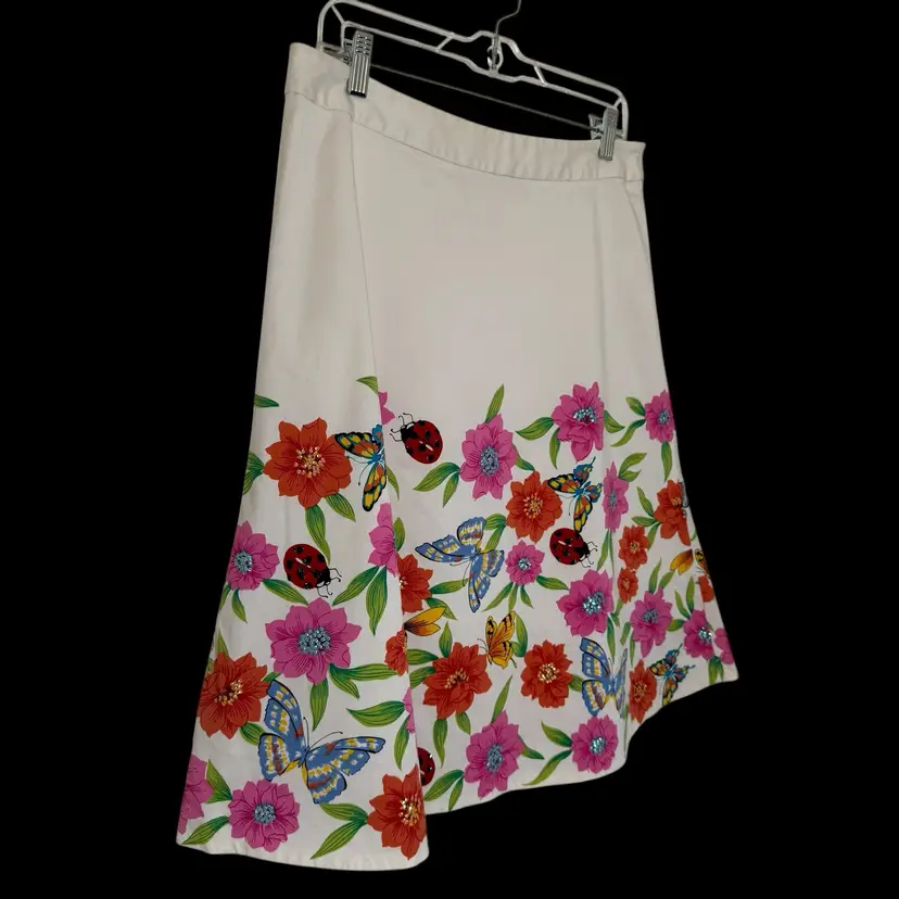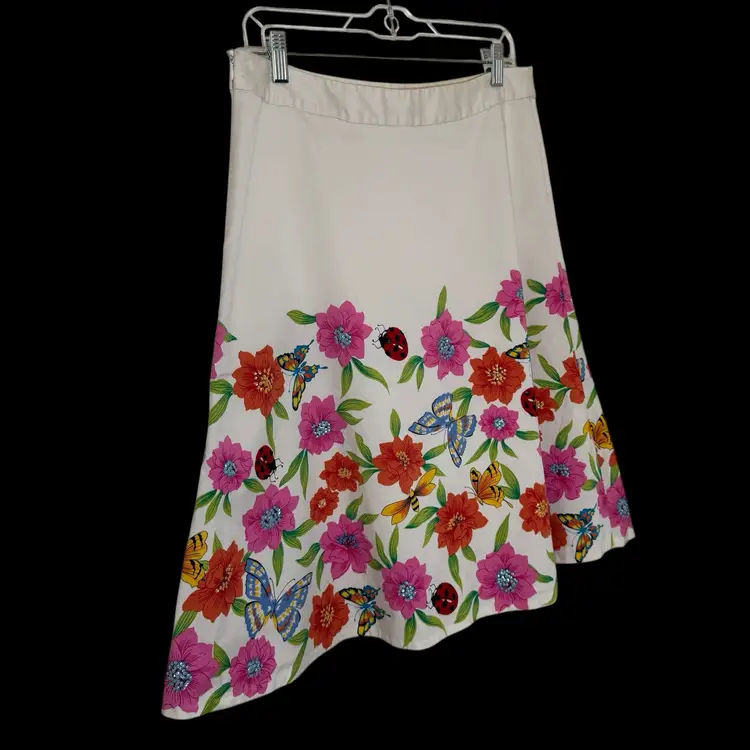 The Spencer Jeremy A-Line Skirt is a vintage piece perfect for a garden party or art-themed event. The vibrant floral pattern with butterflies, bees, and sequin accents adds a whimsical touch to the knee-length skirt, making it a unique and eye-catching addition to any wardrobe. The mid-rise skirt features a zip closure and is made of a woven fabric, ideal for a casual or travel occasion in the summertime. With its nature-inspired theme and art-to-wear style, this skirt is a statement piece that is sure to turn heads.