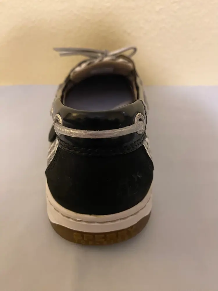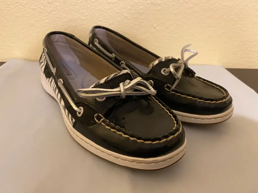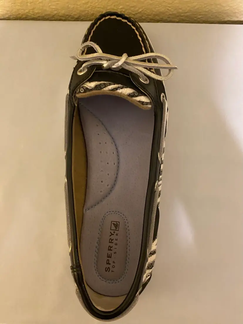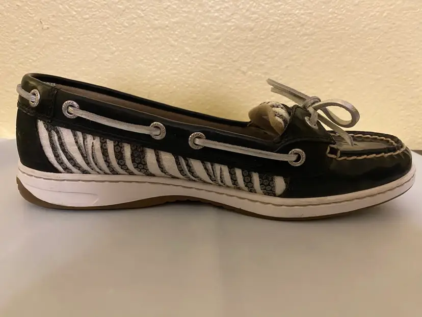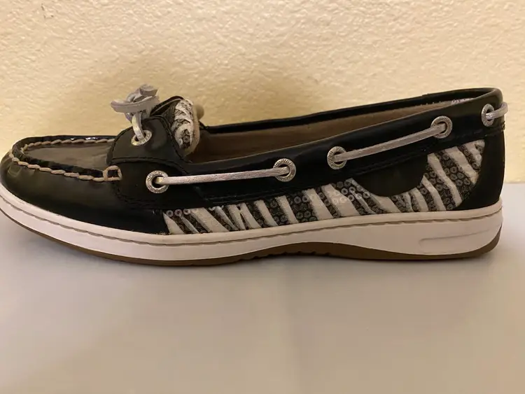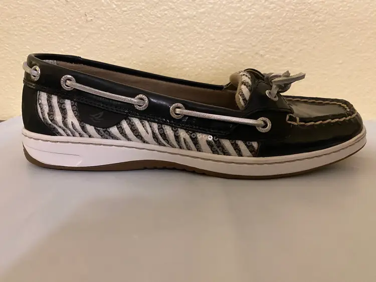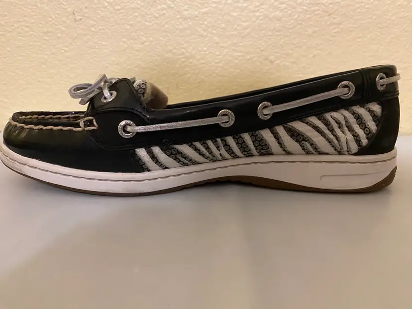 You are purchasing one pair of Women's Size 8M Black w/ Zebra Pattern Boat Shoes by Sperry and their Top Sider line. These Shoes are in overall great condition. No rips, holes or stains on the main material. No fraying of the Laces. No holes or issues on the Insoles. Trim is goof with minimal wear. Bottoms are in good shape with great tread.