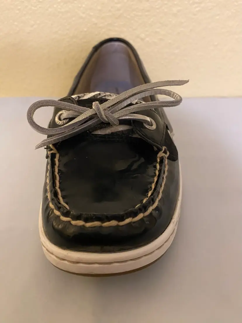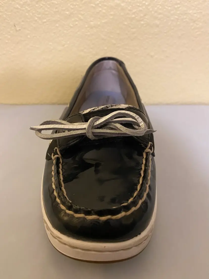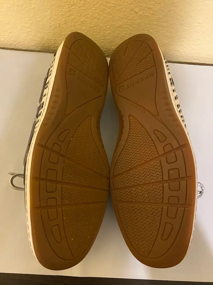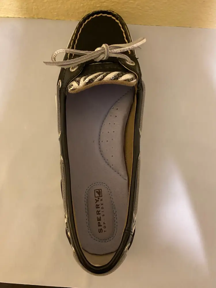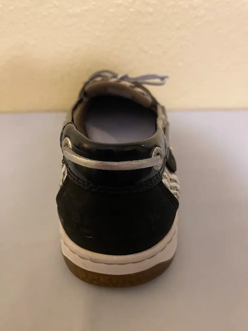 You are purchasing one pair of Women's Size 8M Black w/ Zebra Pattern Boat Shoes by Sperry and their Top Sider line. These Shoes are in overall great condition. No rips, holes or stains on the main material. No fraying of the Laces. No holes or issues on the Insoles. Trim is goof with minimal wear. Bottoms are in good shape with great tread.