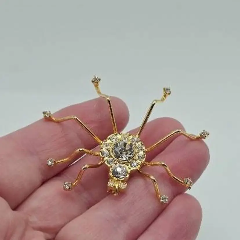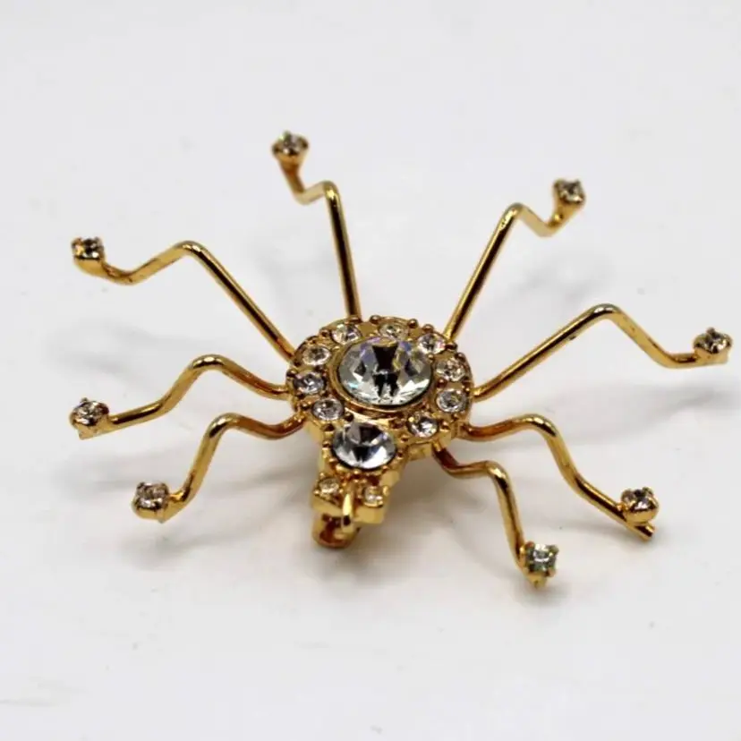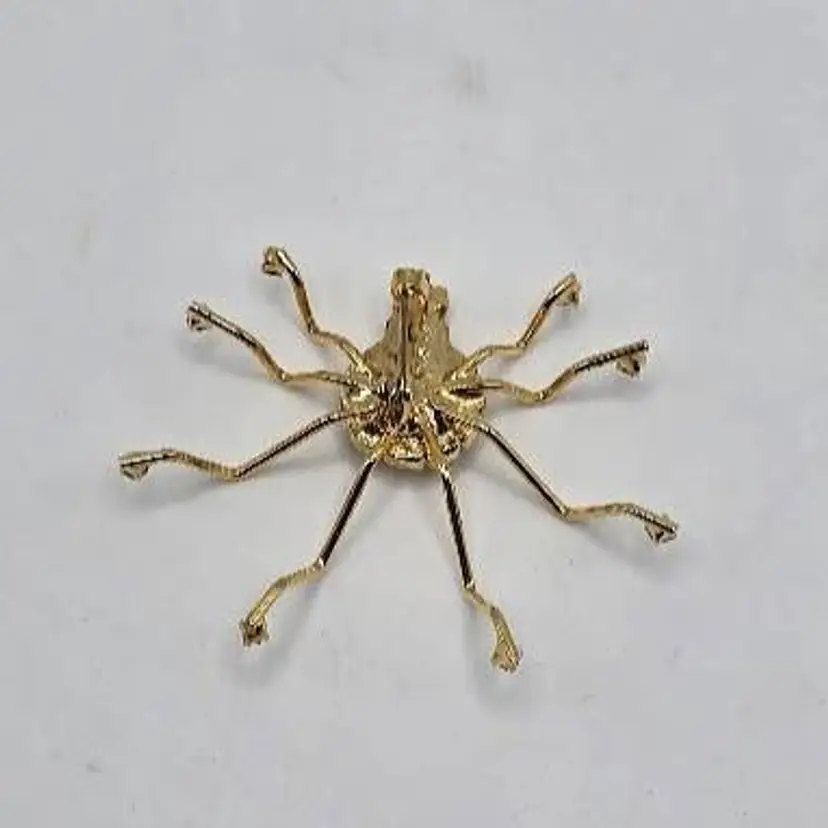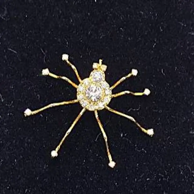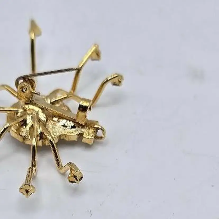 Fun gold tone spider brooch with loop for pendant use. Decorated with clear rhinestones, he measures 2.25" wide x 2" long x 3/8" height. No maker's mark.